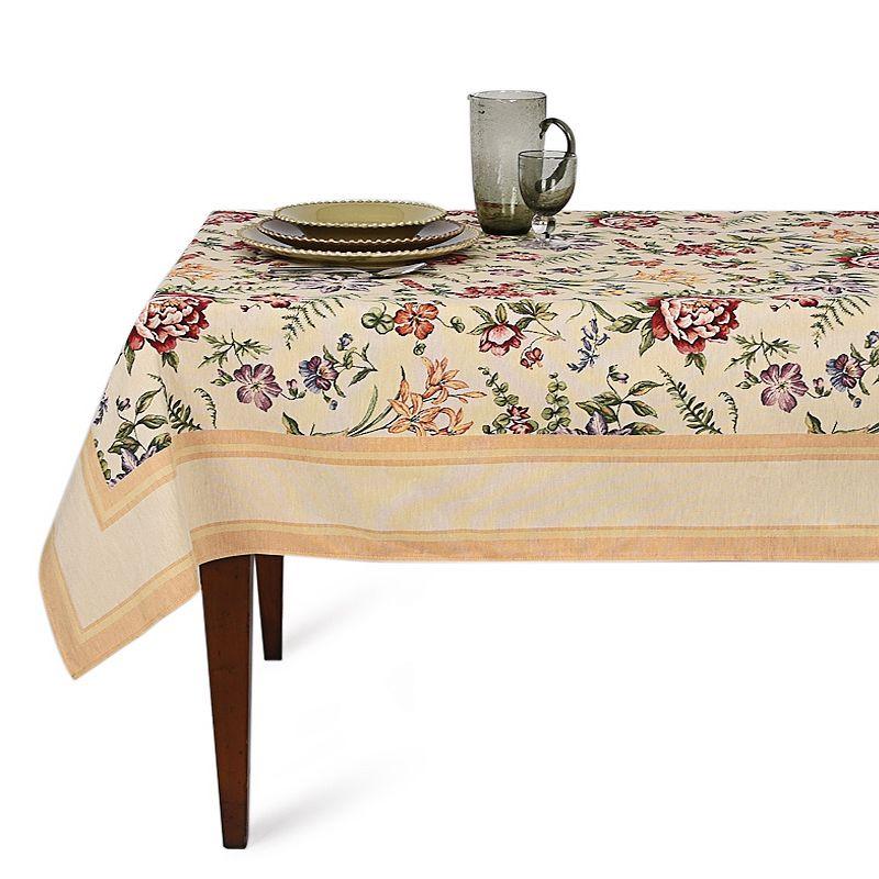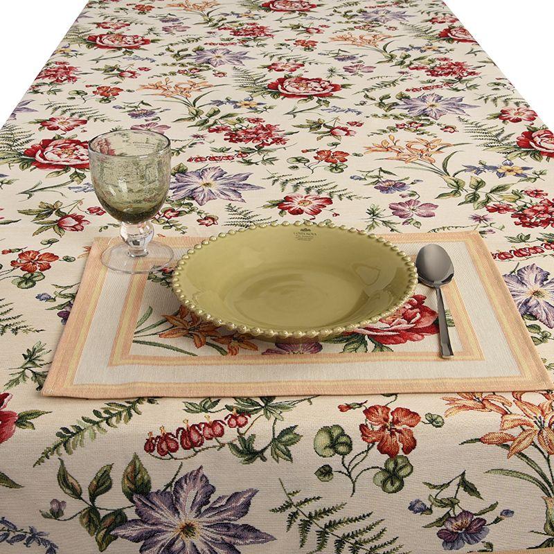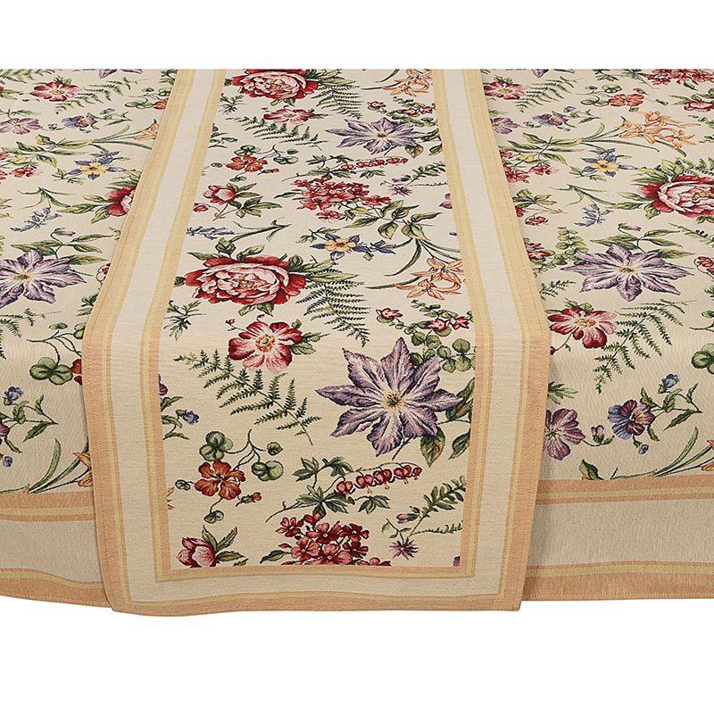 Дивовижна скатертина з преміальної колекції «Амара» чудово підійде для декорування столу. Центр гобеленової скатертини усипаний барвистими квітами, основним тлом виробу є бежевий. На такій скатертині навіть однотонний сервіз виглядатиме святково. Скатертина підійде для сервірування трапези не тільки в їдальні, а й у саду просто неба.