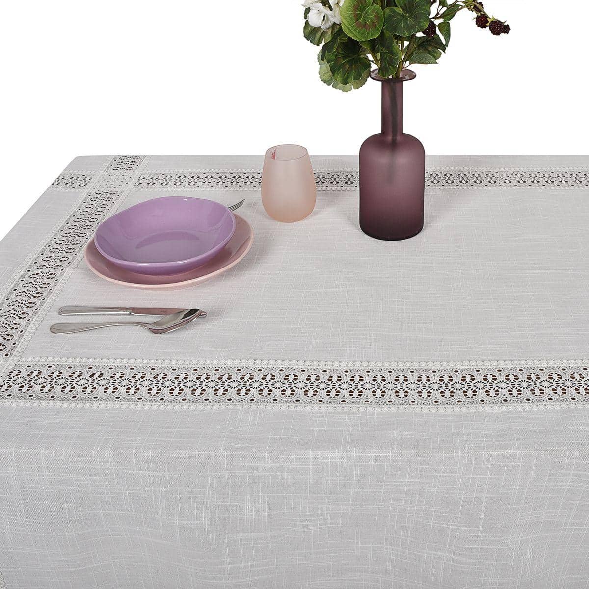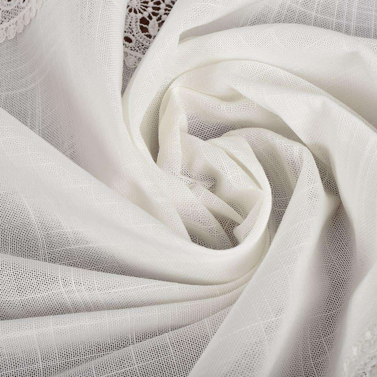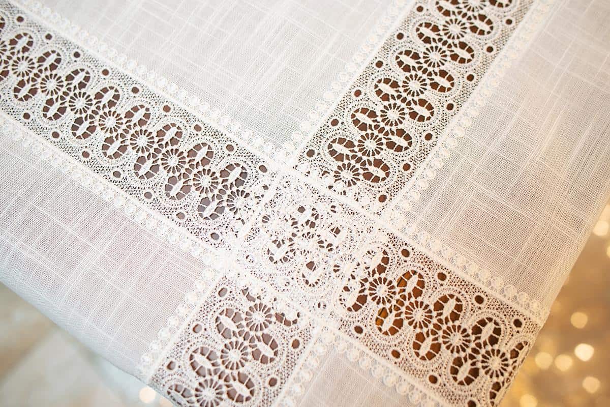 Материал, из которого сшит скатерть, внешне схож с накрахмаленным льняным полотном редкого плетения. Однако соткан он из волокон полиэстера, поэтому уход за таким текстилем очень прост. Машинная стирка легко удаляет загрязнение, а сильные пятна без следа исчезнут после обработки средствами для синтетики.