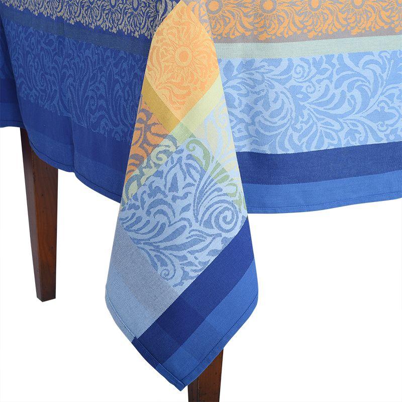 Эффектная скатерть в сине-желтой палитре создана из плотного французского текстиля со сложным фактурным плетением. Текстиль от ведущего французского производителя отвечает строгим требованиям практичности и эстетики.