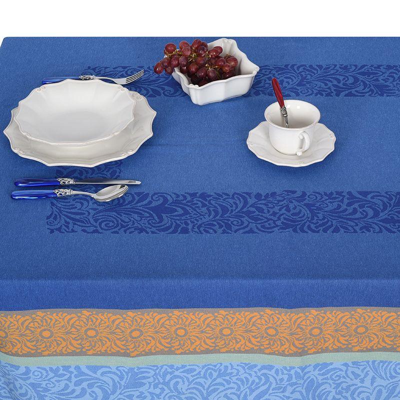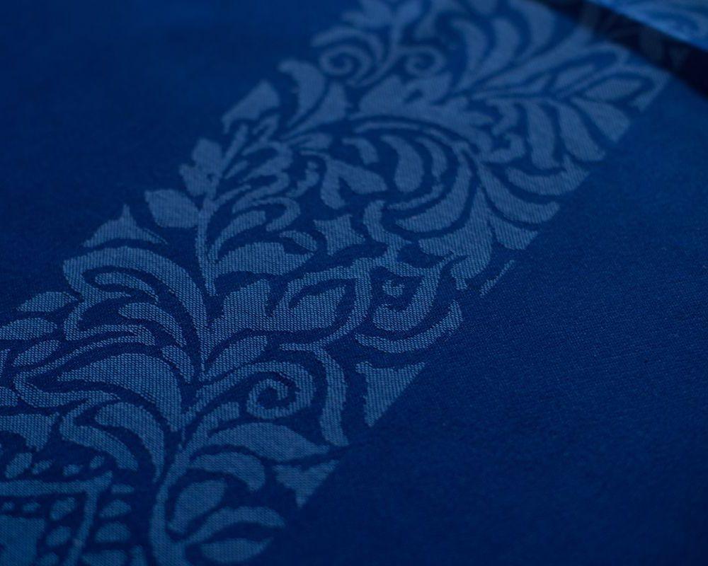 Эффектная скатерть в сине-желтой палитре создана из плотного французского текстиля со сложным фактурным плетением. Текстиль от ведущего французского производителя отвечает строгим требованиям практичности и эстетики.