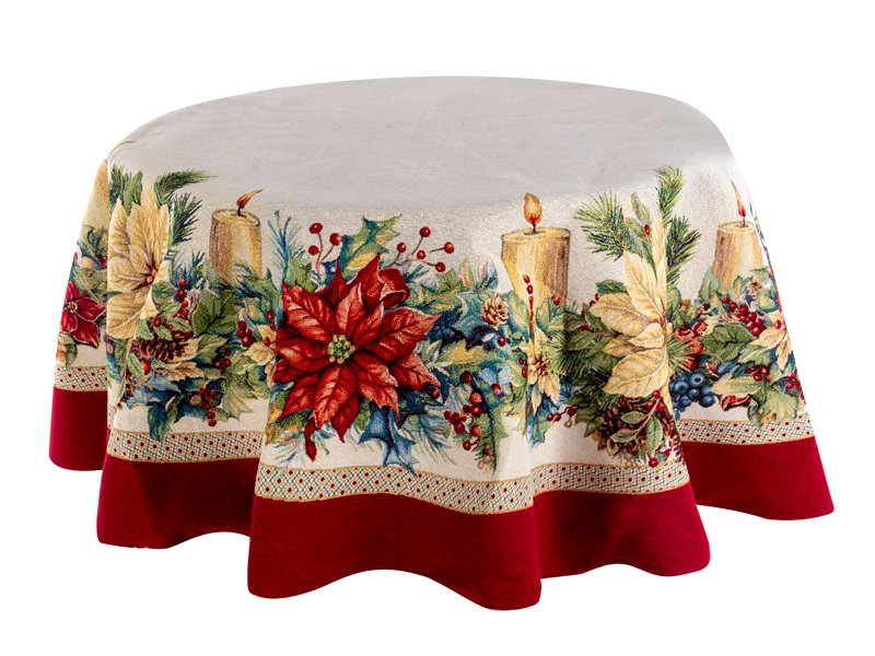Гобеленова скатертина “Catalina” — це справжня святкова окраса вашого столу. Насичений малюнок зі свічками, яскравими пуансеттіями, гілочками хвої та червоно-зеленими акцентами створює атмосферу тепла, затишку та зимового свята. Червона облямівка по периметру додає урочистості та робить скатертину виразною домінантою сервірування. Вона стане стильним центром уваги та чудовою основою для новорічного декору.