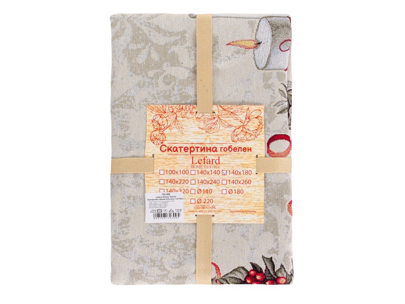 Скатертина гобеленова Kris lurex — це вишукане поєднання святкового декору та делікатного блиску. Світле тло з ледь помітним візерунком прикрашене по краях яскравими різдвяними мотивами: червоні пуансетії, свічки, ялинові гілки, кулі та банти утворюють гармонійну композицію. Завдяки вплетеним ниткам люрексу тканина красиво мерехтить при світлі, надаючи атмосфері урочистості та елегантності.