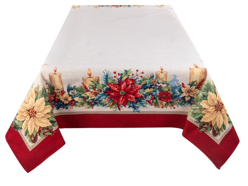 Гобеленова скатертина “Catalina” — це справжня святкова окраса вашого столу. Насичений малюнок зі свічками, яскравими пуансеттіями, гілочками хвої та червоно-зеленими акцентами створює атмосферу тепла, затишку та зимового свята. Червона облямівка по периметру додає урочистості та робить скатертину виразною домінантою сервірування. Вона стане стильним центром уваги та чудовою основою для новорічного декору.