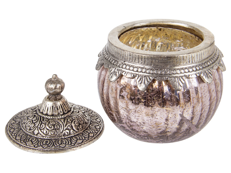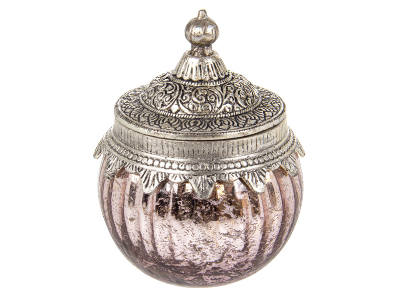 Банки представлені у різних розмірах і кольорах: від компактних моделей 9х9 см для дрібниць до містких варіантів 17х10 см у сірому та рожевому кольорі. Скло з ефектом старовинного покриття та металева кришка з багатим орнаментом створюють неповторну гру світла, додаючи теплого сяйва будь-якому простору. Такі вироби гармонійно виглядатимуть і на туалетному столику, і на полиці у вітальні, і на кухні.