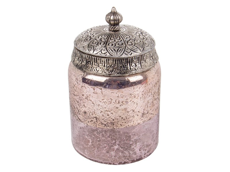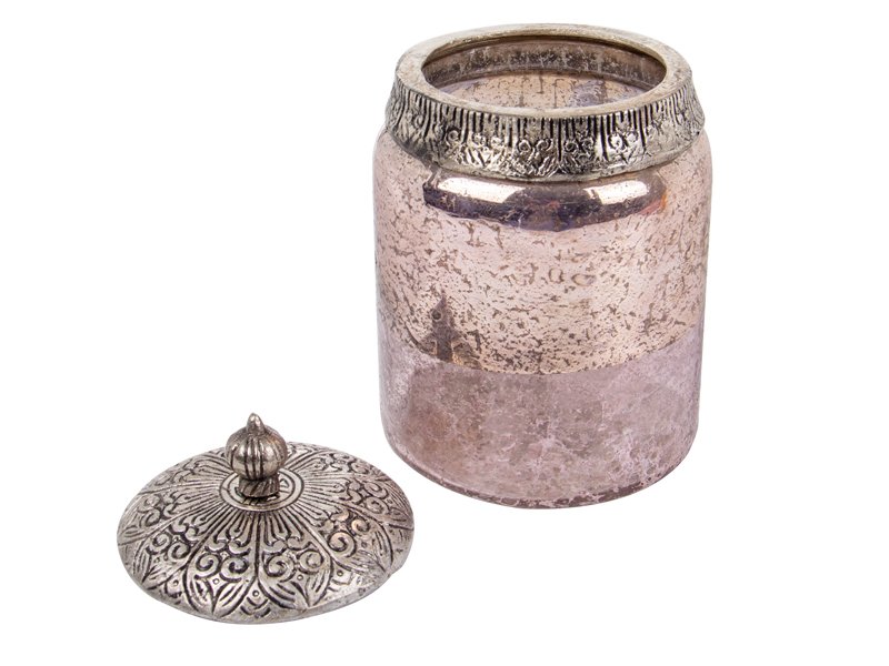 Банки представлені у різних розмірах і кольорах: від компактних моделей 9х9 см для дрібниць до містких варіантів 17х10 см у сірому та рожевому кольорі. Скло з ефектом старовинного покриття та металева кришка з багатим орнаментом створюють неповторну гру світла, додаючи теплого сяйва будь-якому простору. Такі вироби гармонійно виглядатимуть і на туалетному столику, і на полиці у вітальні, і на кухні.