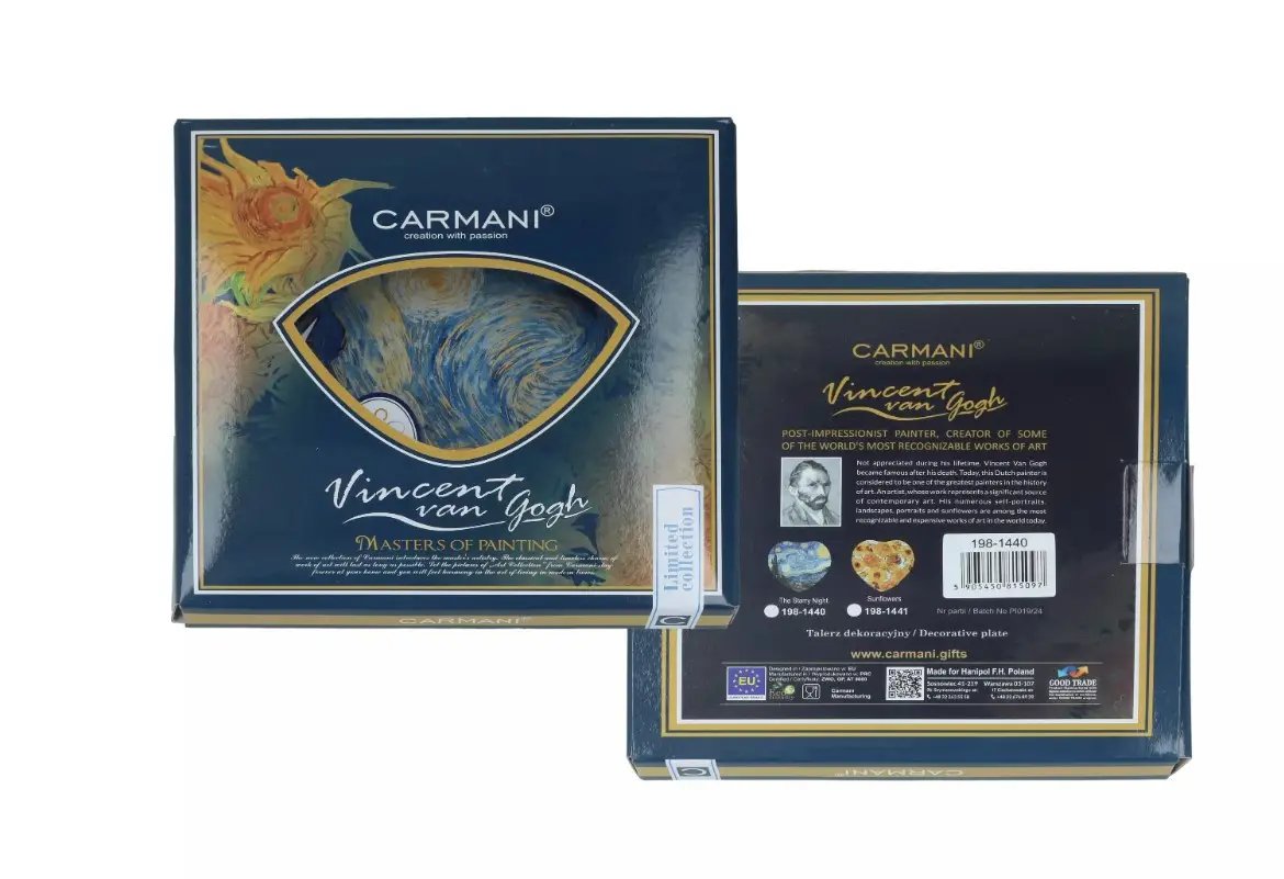 Поставляється в ефектній подарунковій коробці, що робить тарілку чудовим презентом для особливого випадку: на День святого Валентина, річницю, весілля або як вираз любові та вдячності. Carmani - це колекційна естетика з європейським смаком. Додайте частинку натхнення Ван Гога у свій дім або зробіть по-справжньому незабутній подарунок.