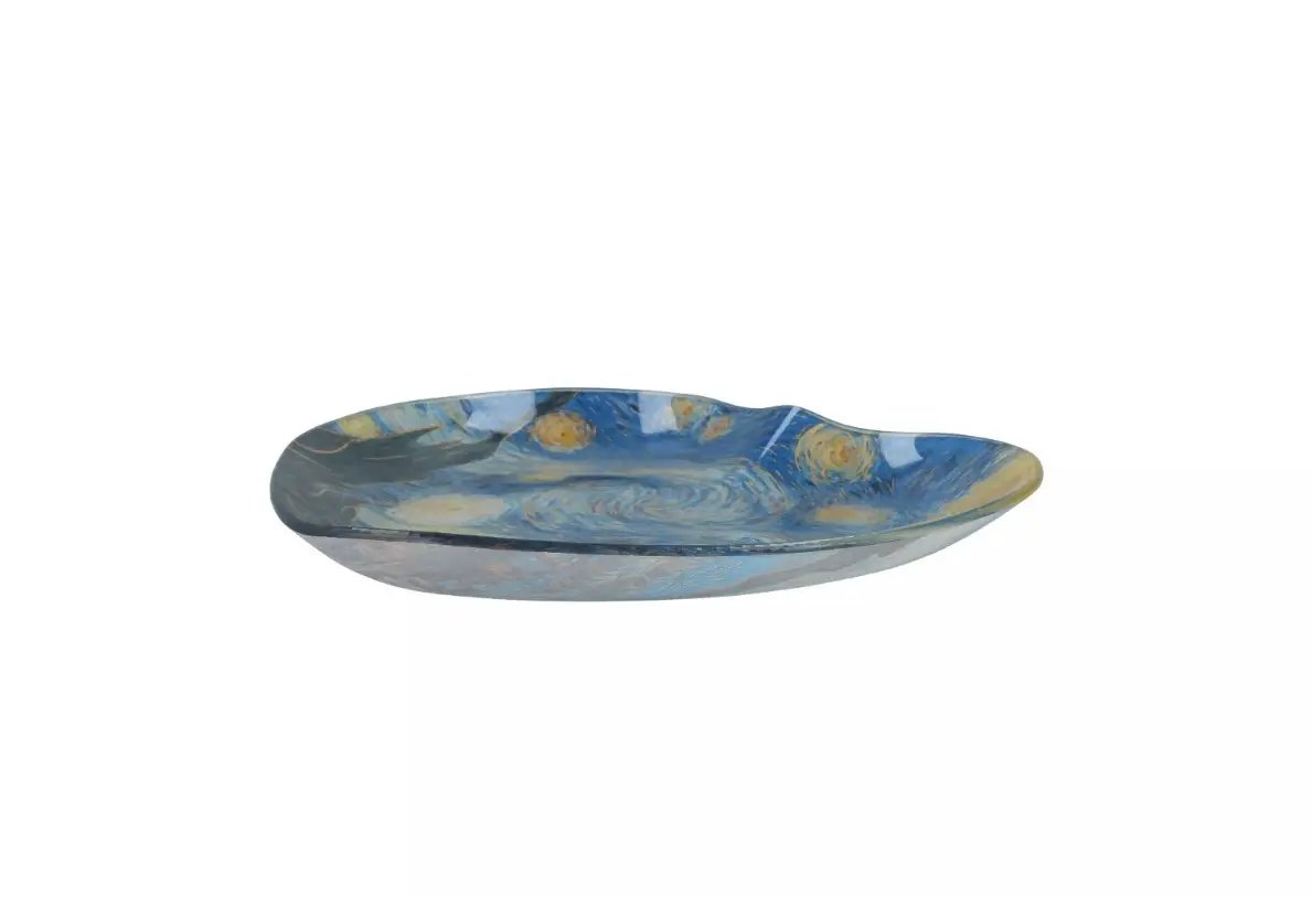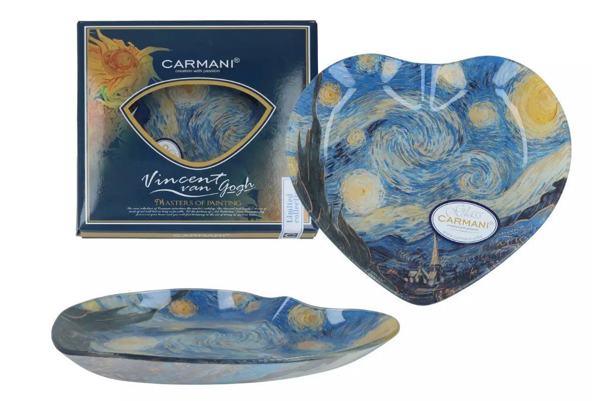 Скляна тарілка-серце Carmani «Зоряна ніч» - це яскравий акцент для дому, в якому цінують красу мистецтва. Репродукція знаменитого полотна Вінсента Ван Гога вражає детальним опрацюванням і насиченими відтінками. Вихрове нічне небо, сяючі зірки та динамічні мазки передають атмосферу таємниці та натхнення. Така річ перетворює звичайне сервірування на естетичну насолоду.