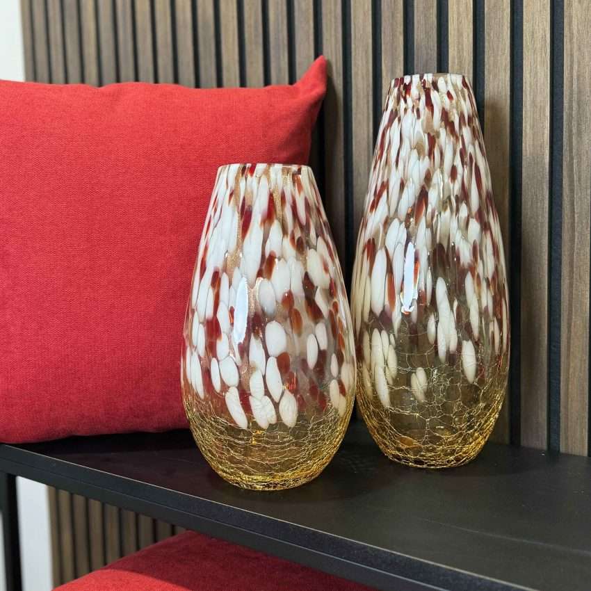 Її дизайн вирізняється плавними формами та насиченим поєднанням кольорів. Верхня частина вази декорована краплистими візерунками у відтінках червоного та оранжевого, що нагадують пелюстки або краплі фарби. Нижня частина поступово переходить у золотавий колір, надаючи виробу глибини і витонченості. Внутрішня текстура скла має легкі тріщинки, що створює додатковий ефект кракле, надаючи вазі вишуканого та старовинного вигляду. Цей аксесуар стане стильним доповненням інтер'єру, додаючи йому тепла та затишку.