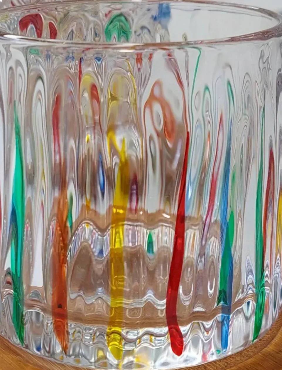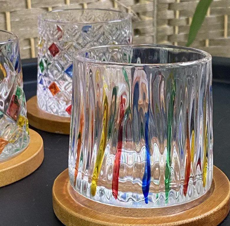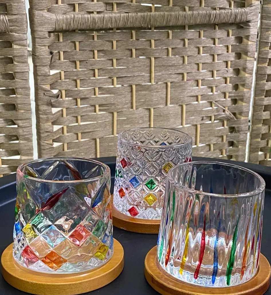 Ці яскраві склянки-дози — не просто посуд, а влучний акцент вашого столу та настрою. Геометричний візерунок з кольоровими вставками миттєво привертає увагу й створює враження свята навіть у буденний день. Напій у такому келиху розкривається по-новому — будь то віскі, фреш, коктейль чи звичайна вода.