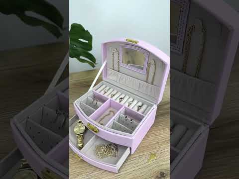 Верхній рівень оснащений м’якими валиками для каблучок і сережок, кількома окремими відділеннями, дзеркалом, а також спеціальними гачками для ланцюжків і браслетів.