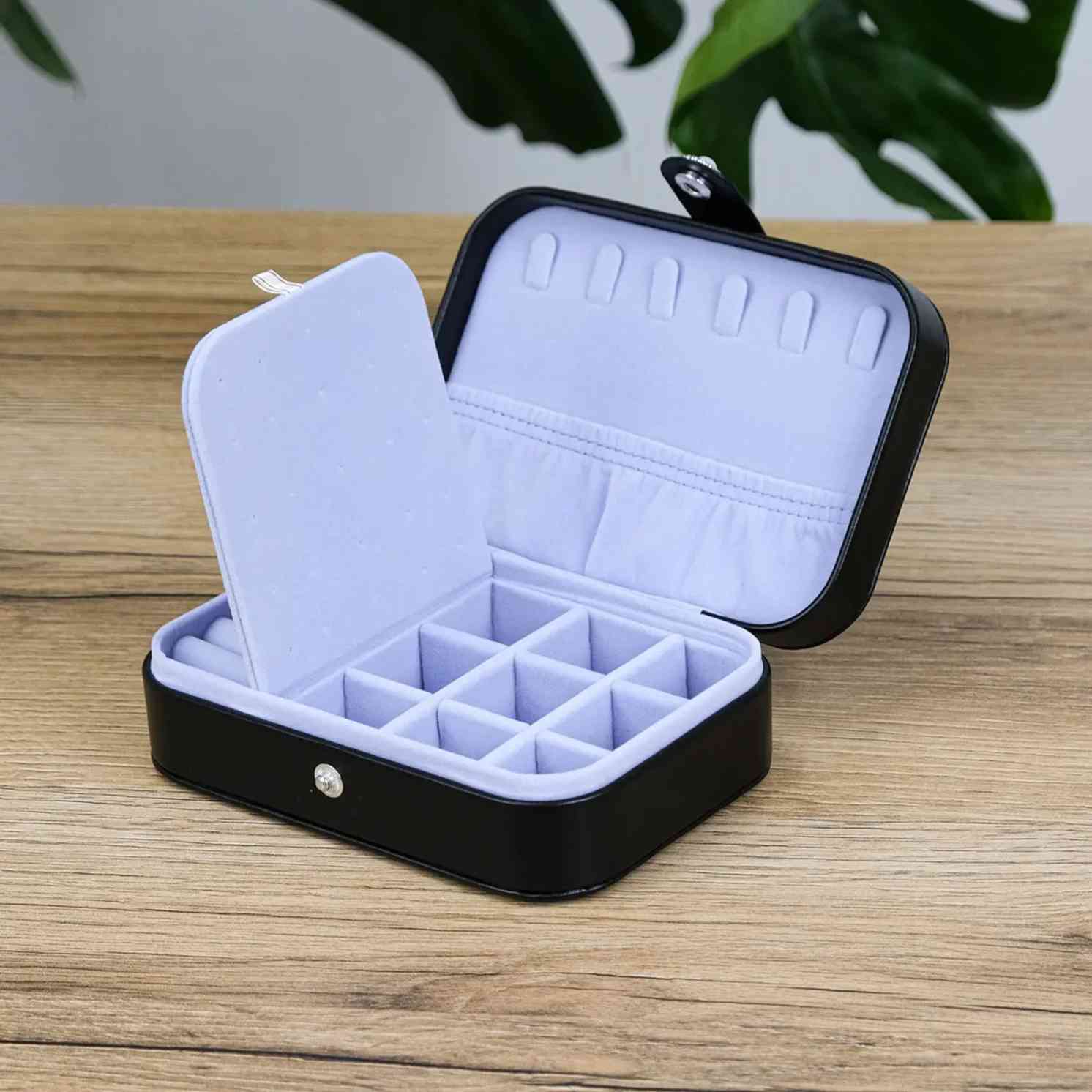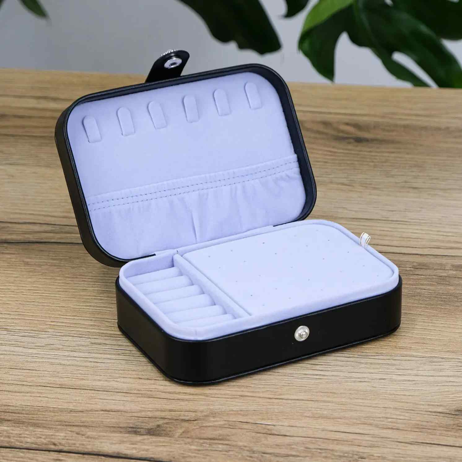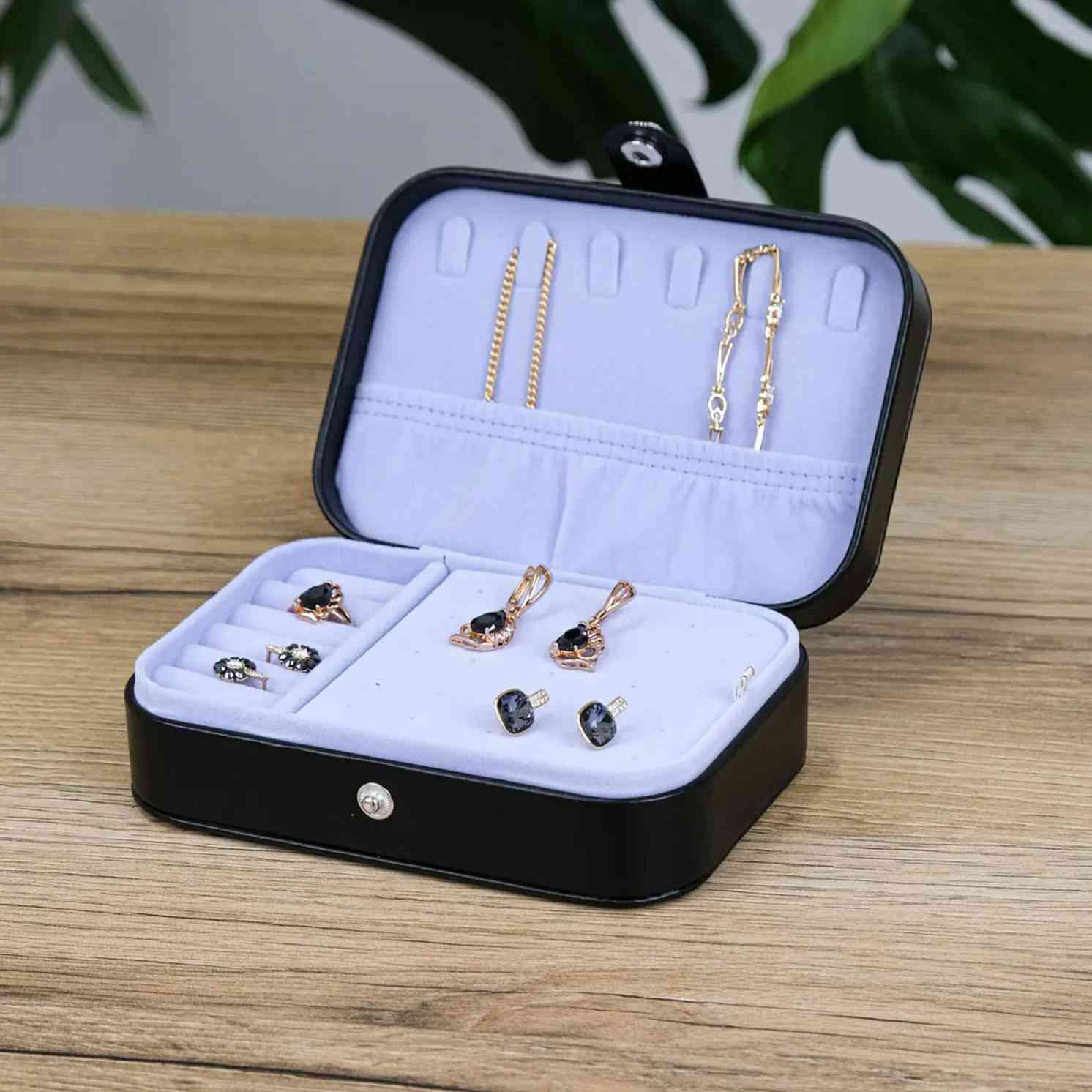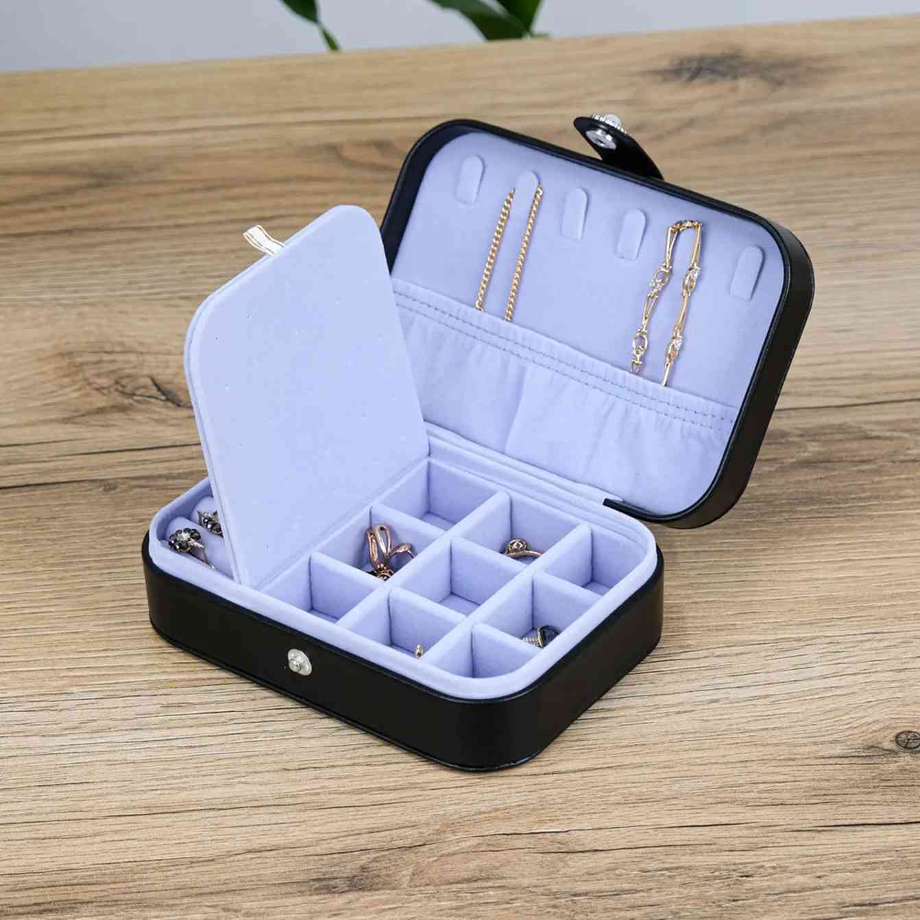 Всередині — логічно організований простір, де все на своїх місцях. Відділення для каблучок, сережок і ланцюжків допомагають швидко розкласти прикраси та забути про безлад. Нічого зайвого — лише зручність: відкрили, обрали, закрили. Світла внутрішня підкладка підкреслює прикраси та робить їх добре помітними.