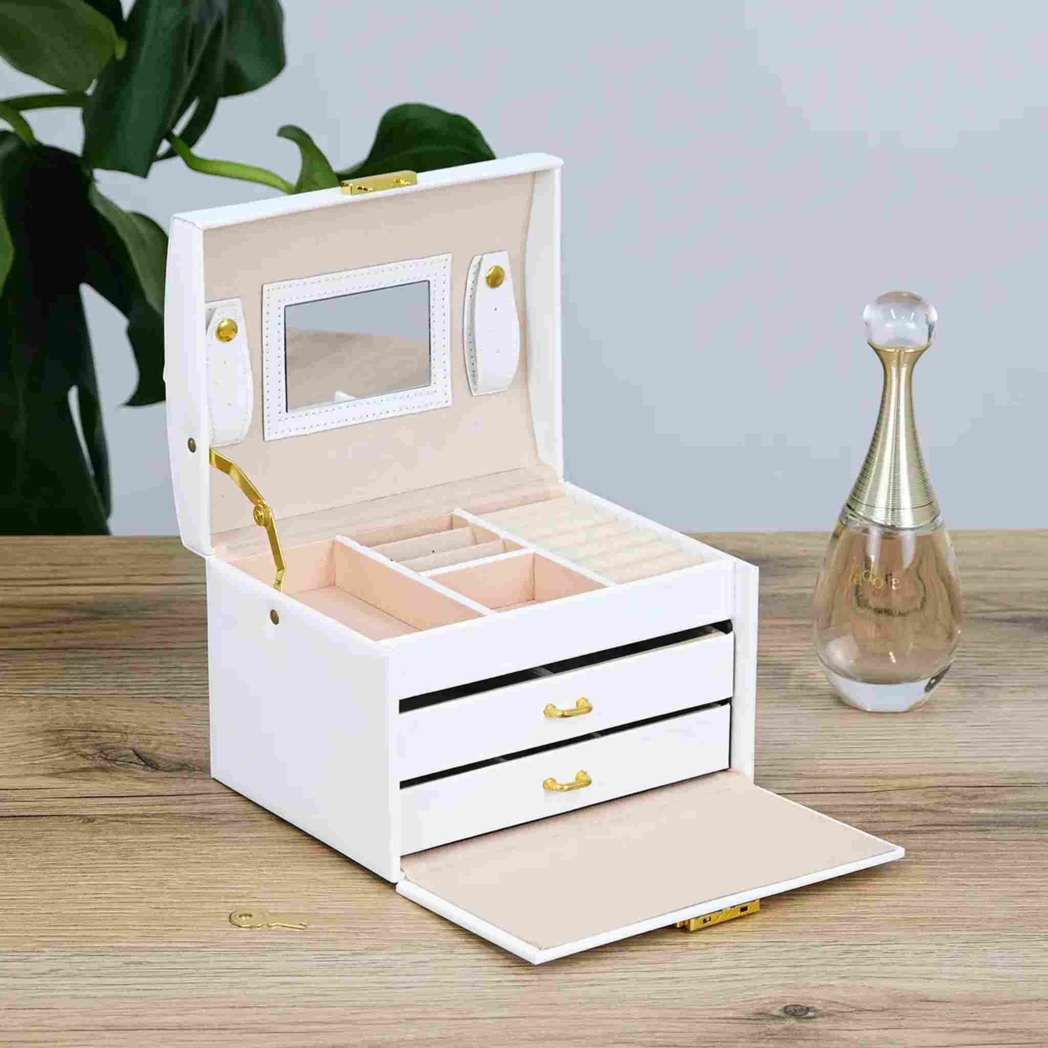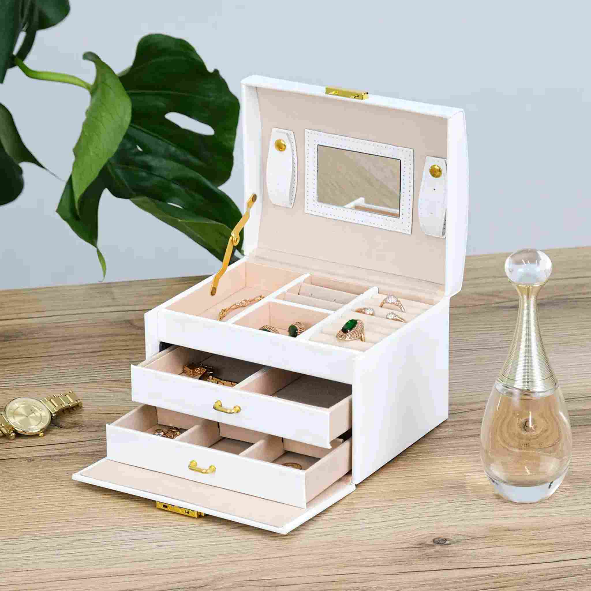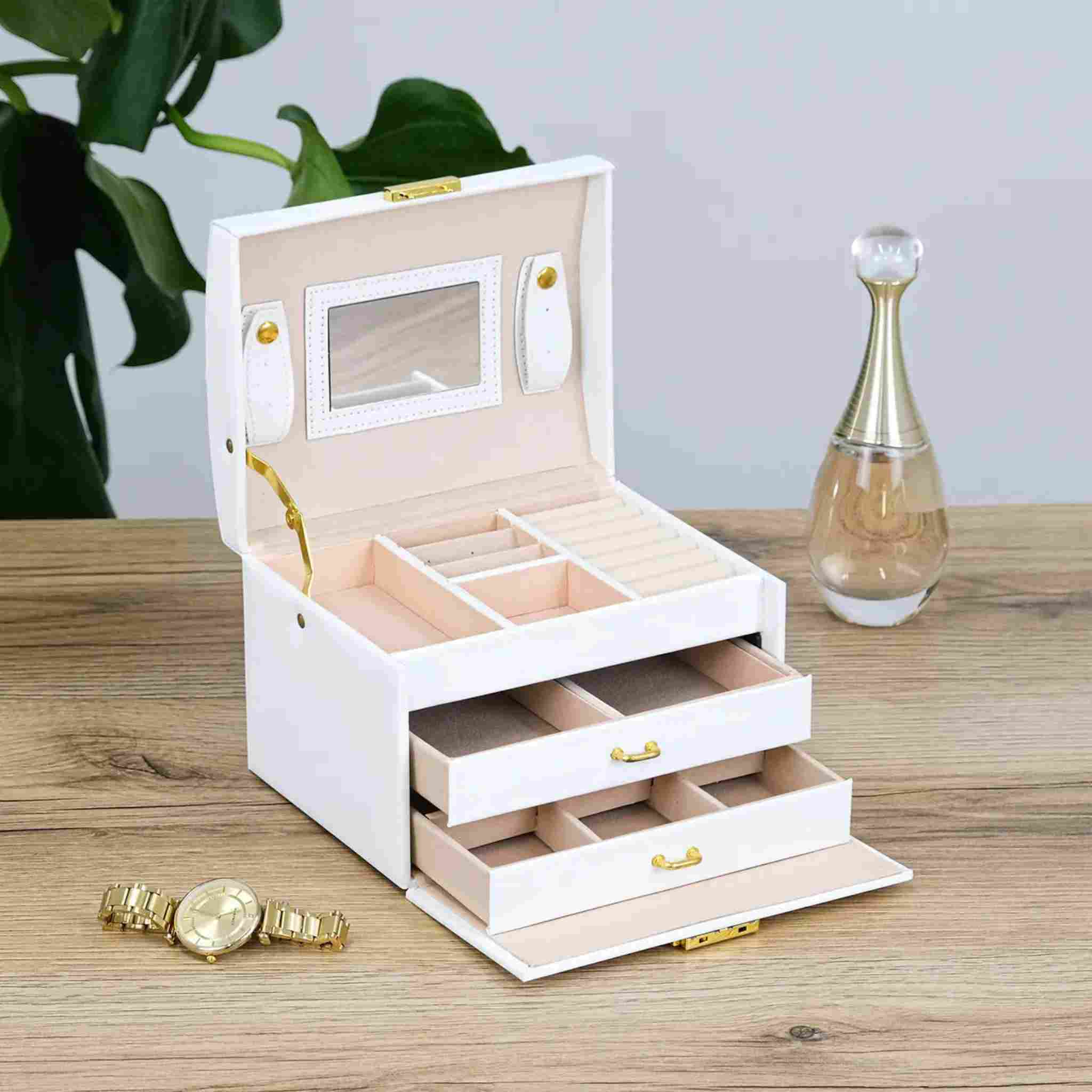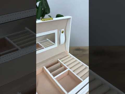 Верхній рівень оснащений відділеннями для каблучок, сережок та дрібних аксесуарів, а також має вбудоване дзеркало, яке дозволяє зручно приміряти прикраси.