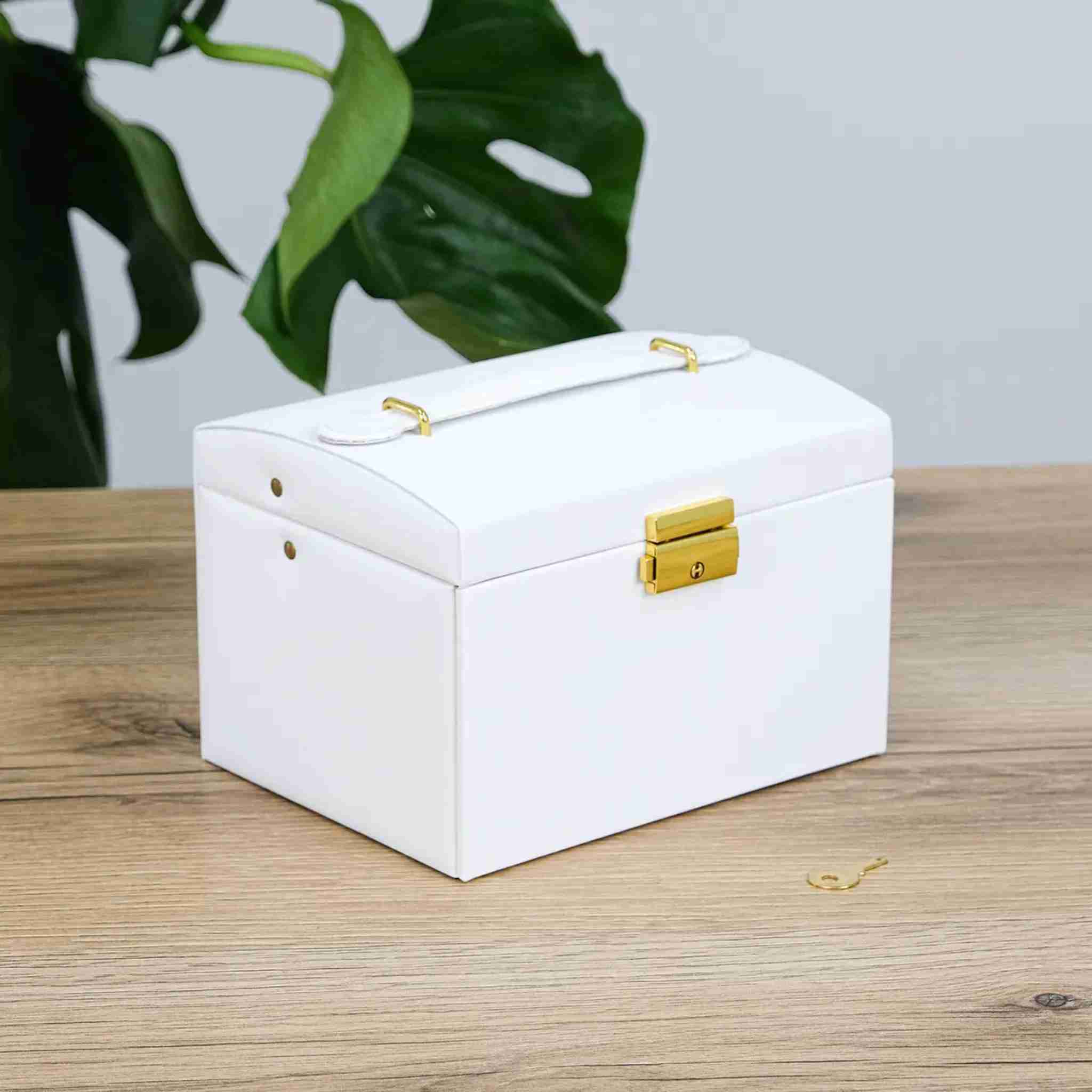 Ця стильна скринька білого кольору стане ідеальним рішенням для зберігання ваших улюблених прикрас. Виготовлена з якісної екошкіри, вона має приємну на дотик поверхню та сучасний охайний вигляд, гармонійно доповнюючи будь-який інтер’єр.
