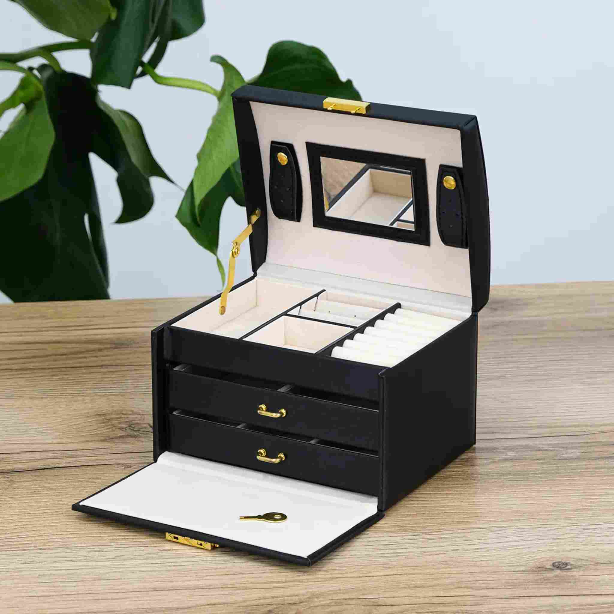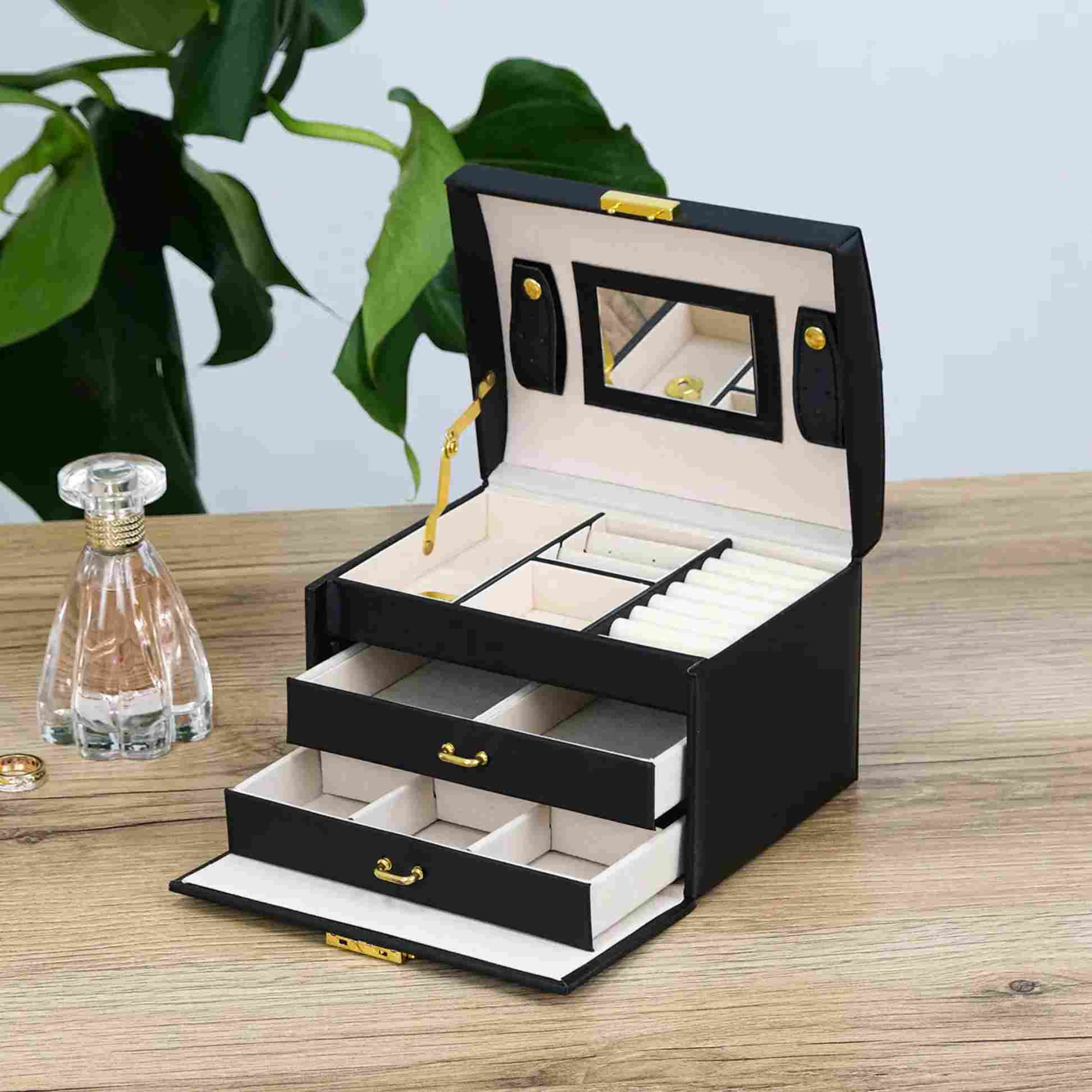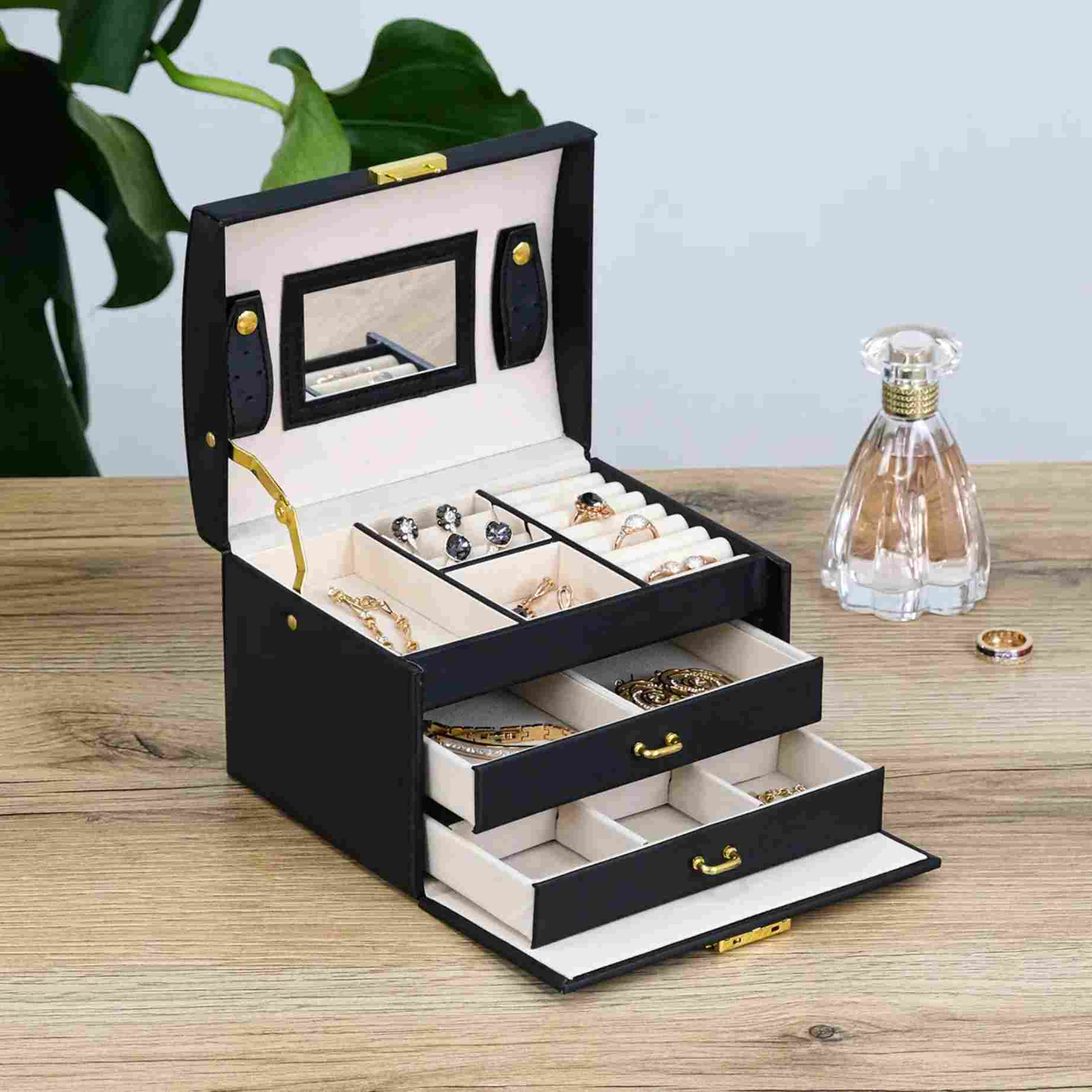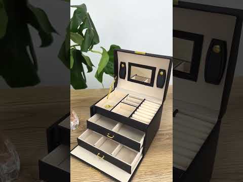 Верхній рівень оснащений відділеннями для каблучок, сережок та дрібних аксесуарів, а також має вбудоване дзеркало, яке дозволяє зручно приміряти прикраси.