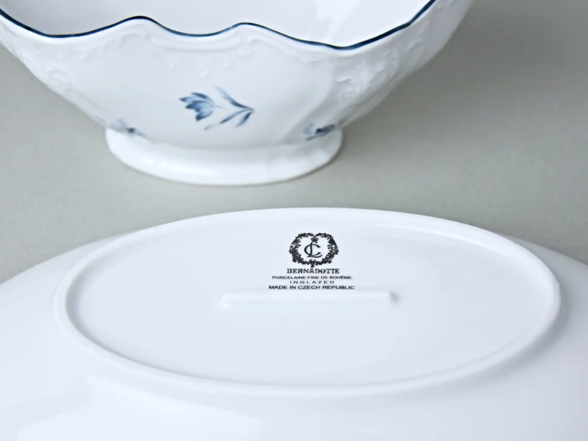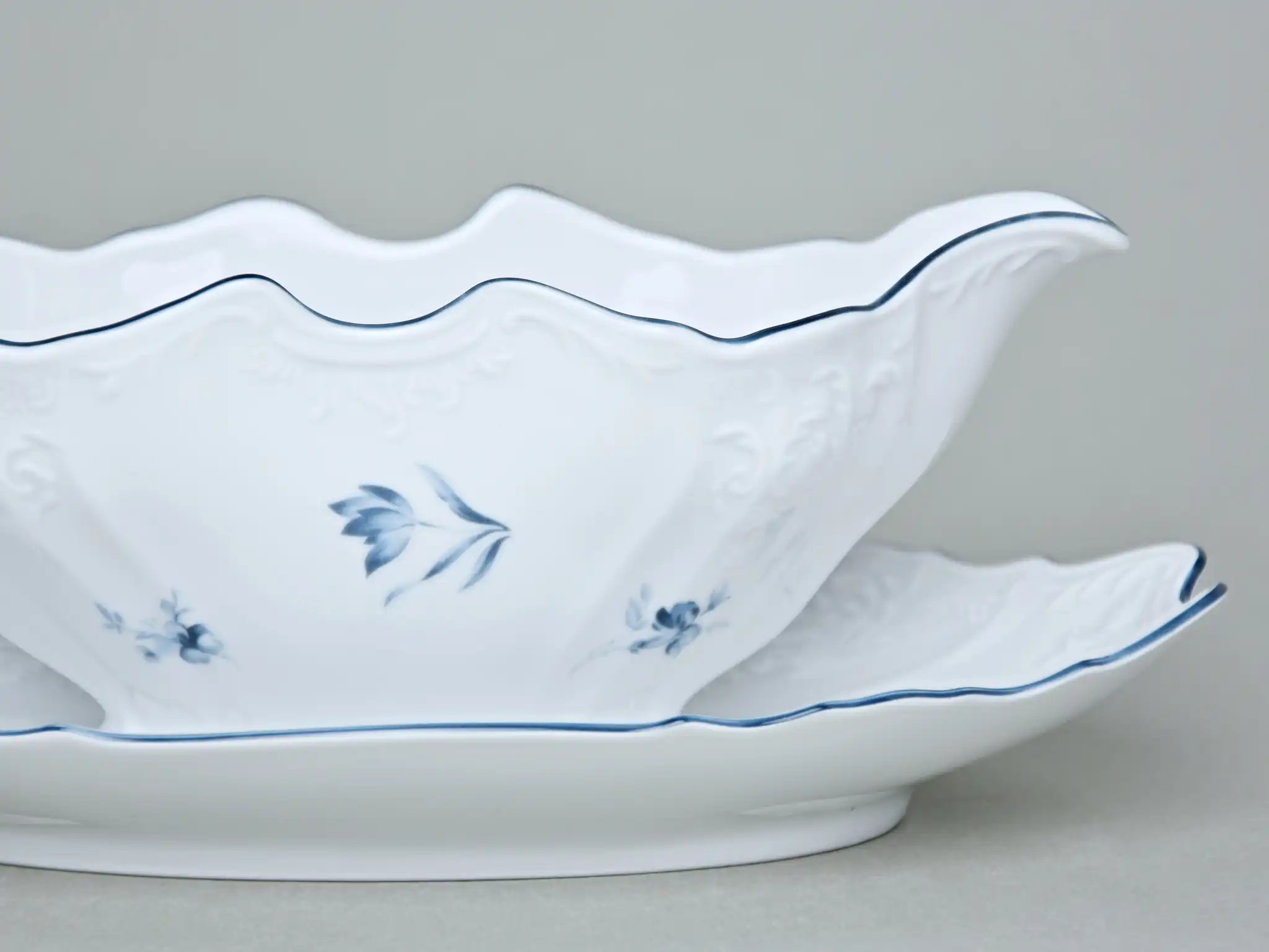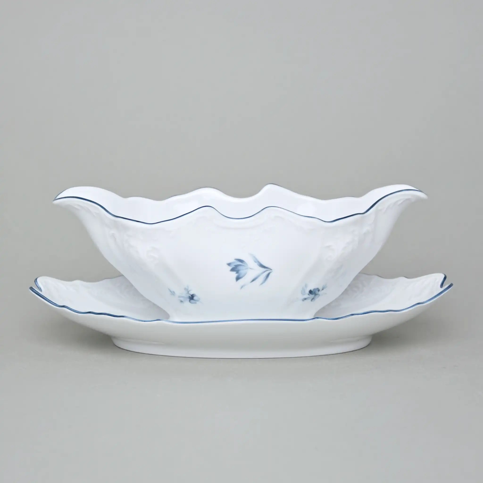 Чешский фарфор от Bernadotte — это гарантия высокого качества и долголетия. Каждый элемент покрыт прочной глазурью, устойчива к царапинам и температурным перепадам. Нежная синяя окантовка и тонкий рельефный рисунок на белоснежной поверхности создают образ, который будет уместен и на семейном ужине, и на праздничной сервировке. Благодаря высокой термостойкости изделия можно использовать не только для соусов, но и для растопленного масла, варенья или сливок.