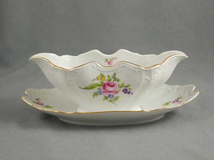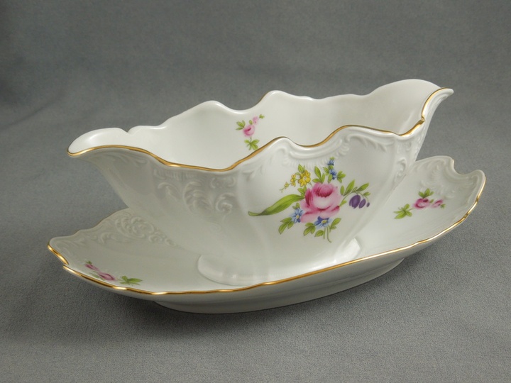 Соусник фарфоровый овальный белый декорированный с золотой каймой Thun Bernadotte Мейсенский букет 500 мл