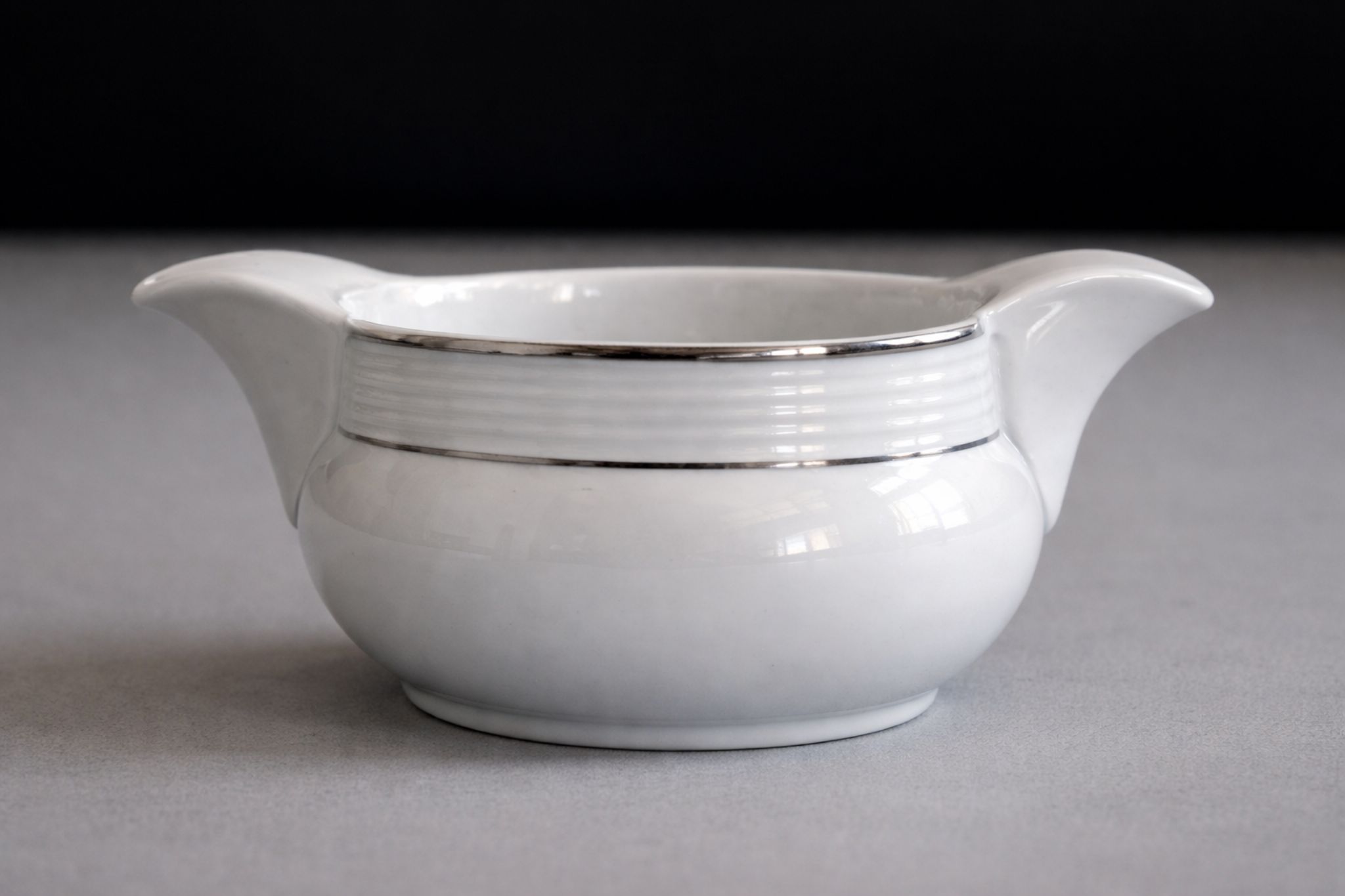 Соусник порцеляновий круглий білого кольору з платиновим подвійним окаймленням на підставці Thun Catrin Подвійне обведення Платина 400 мл