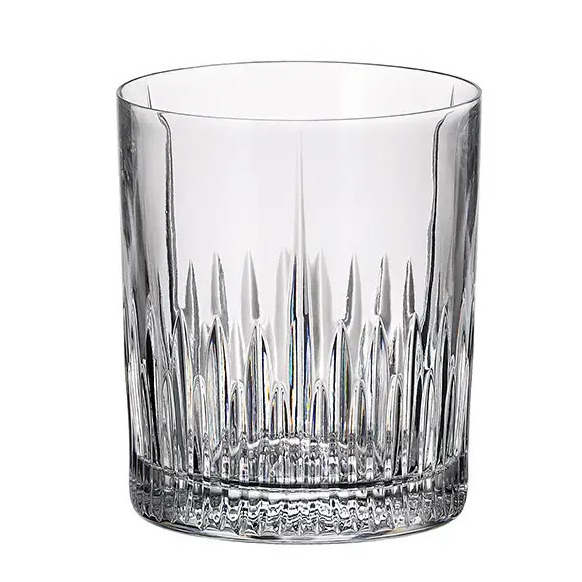 Главным элементом декора коллекции является уникальный рельефный узор, напоминающий расходящиеся вверх лучи света. Этот дизайн создаёт эффект игры света и тени, усиливая блеск и прозрачность стекла. Узкие линии, которые начинаются у основания стакана, плавно расширяются вверх, придавая изделию динамику и глубину. Стаканы коллекции имеют строгую цилиндрическую форму с гладкими краями, что делает их универсальными для использования в любых сервировках — от классических до современных.