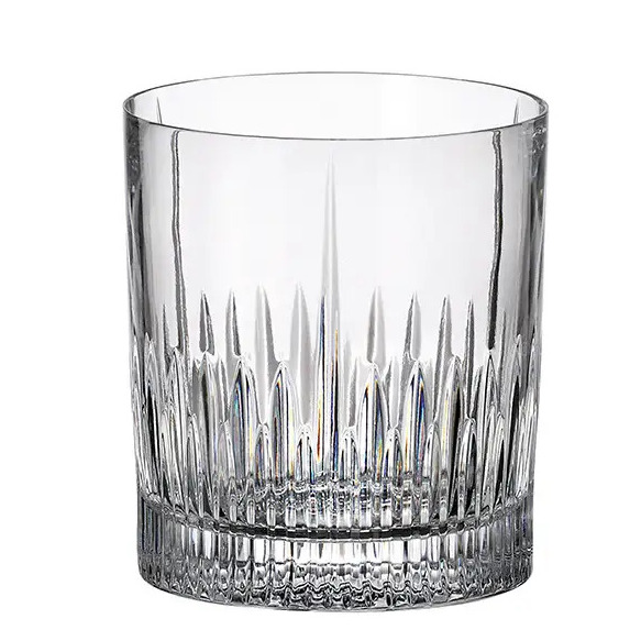 Главным элементом декора коллекции является уникальный рельефный узор, напоминающий расходящиеся вверх лучи света. Этот дизайн создаёт эффект игры света и тени, усиливая блеск и прозрачность стекла. Узкие линии, которые начинаются у основания стакана, плавно расширяются вверх, придавая изделию динамику и глубину. Стаканы коллекции имеют строгую цилиндрическую форму с гладкими краями, что делает их универсальными для использования в любых сервировках — от классических до современных.