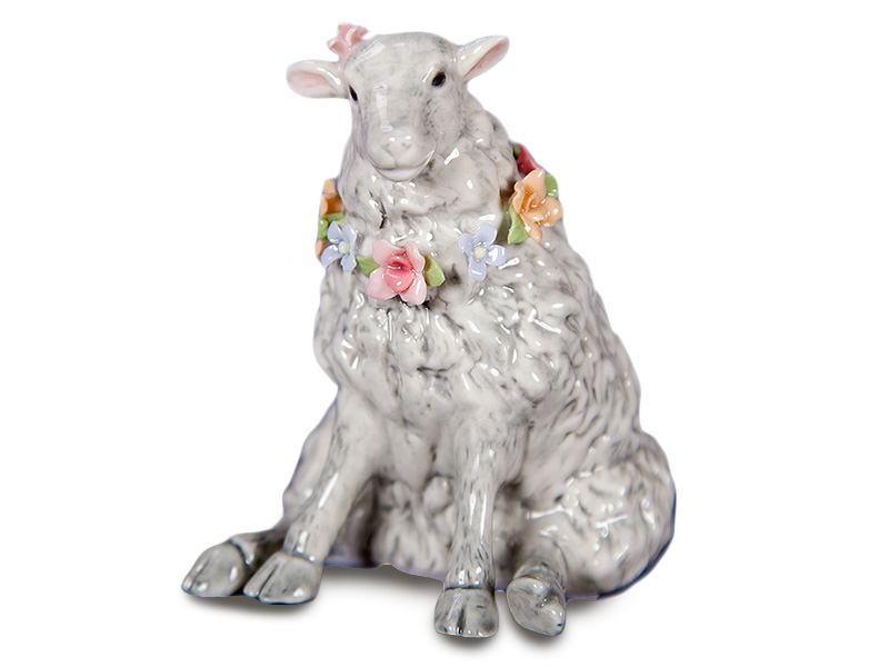 Фигурка «Овечка с венком» выполнена из керамики с глянцевой глазурью. Изделие изображает сидящую овцу с нежным выражением мордочки и венком из разноцветных цветов на шее. Мелкая проработка деталей шерсти и цветочных элементов делает фигурку аккуратной и выразительной.