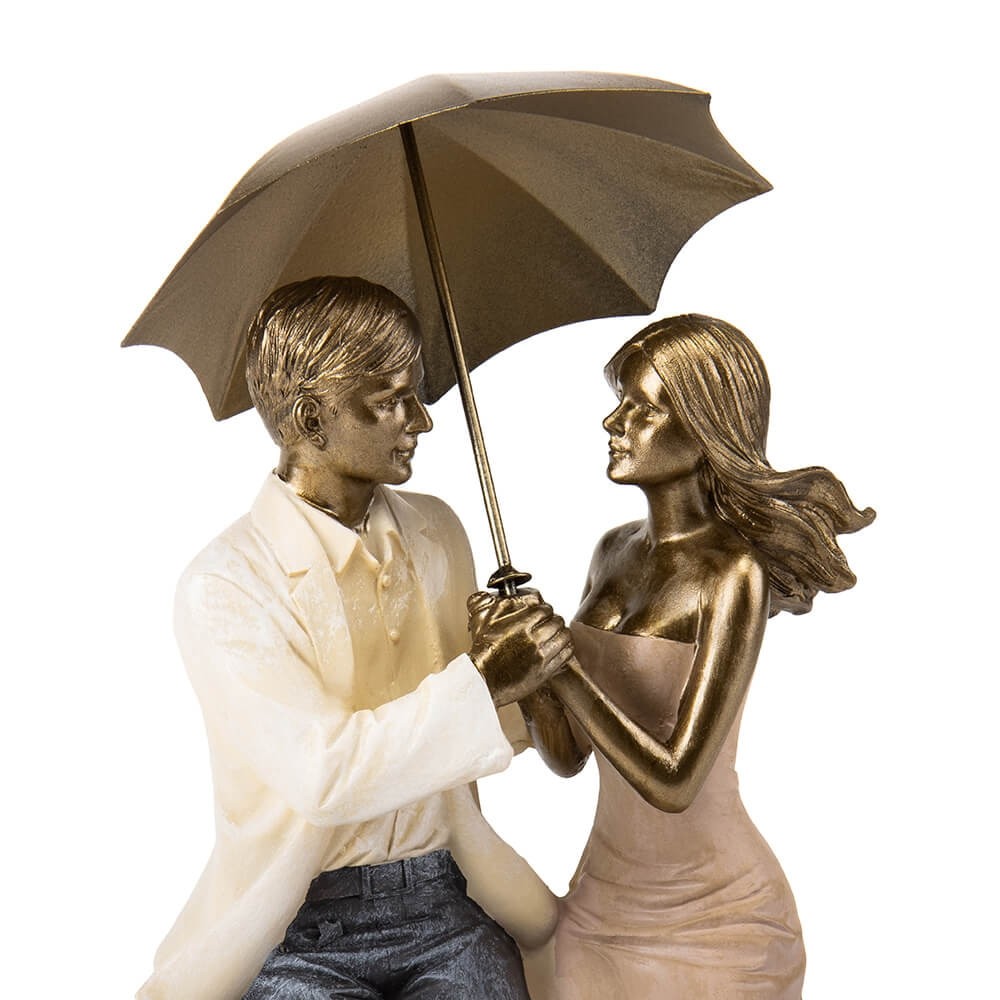 Декоративная фигурка влюбленных под дождем вызывает невероятный восторг своей элегантной формой, реалистичными деталями, качеством. Статуэтка влюбленной пары - это креативный декор для Вашего дома, офиса, магазина или кафе. Также это отличный подарок для второй половинки, на новоселье, важную дату, на День Влюбленных. Статуэтка имеет изысканный внешний вид, она изготовлена из высококачественного материала - полистоуна, имеет благородный бронзовый цвет и нежные оттенки наряда девушки и парня. Статуэтка будет вызывать приятные эмоции и трепетные воспоминания. Фигурка устойчиво стоит на подставке, пара держит съемный зонт. Статуэтка плотно, качественно упакована, зонт упакован отдельно.