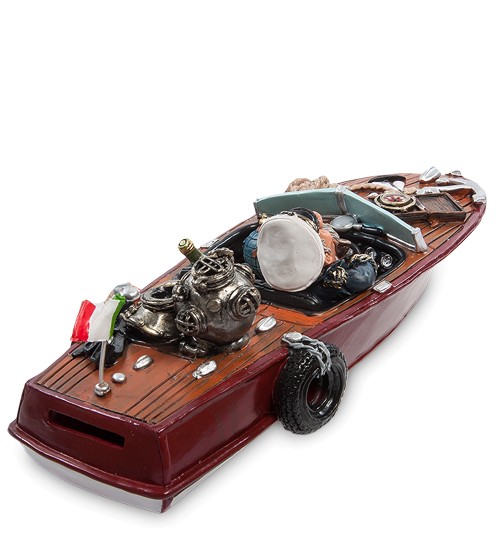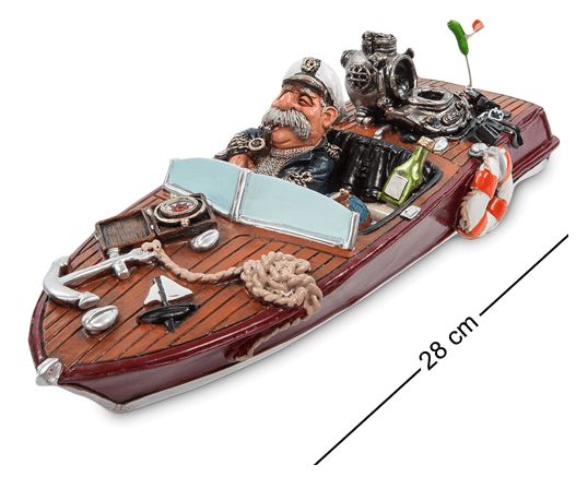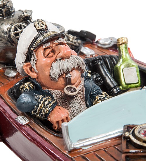 Статуетка капітана на катері стане чудовим подарунком підкорювачу річок, морів та океанів. Статуетка капітана за штурвалом швидкохідного катера. На цьому катері все трохи напоказ. Сивий капітан з люлькою в зубах старуватий вже для великих кораблів, та й не плисти він зібрався, а просто перепочити, недарма пляшками запасся.