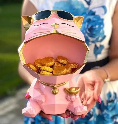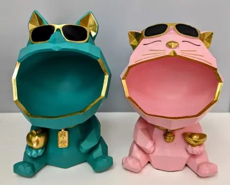 Два кота — в тёмных очках, с серьёзным выражением мордочки и открытым «карманом» — не только украсят полку, комод или тумбу, но и надёжно сохранят ваши ключи, мелочи, флешки и даже конфеты. Выполнены из качественного материала с матовой поверхностью, устойчивой к мелким повреждениям.