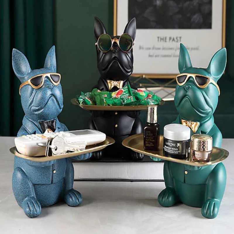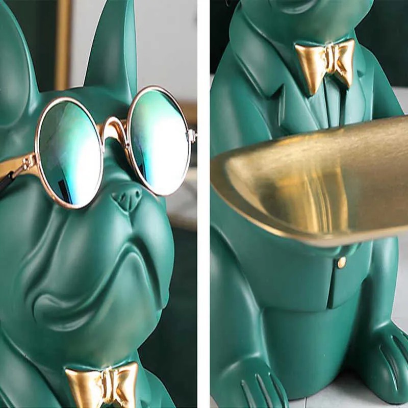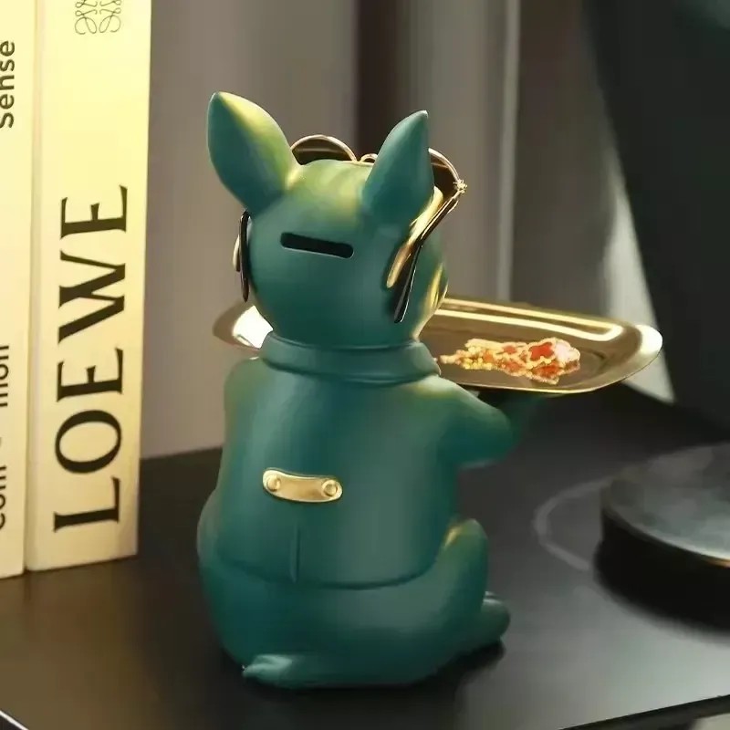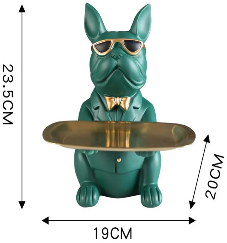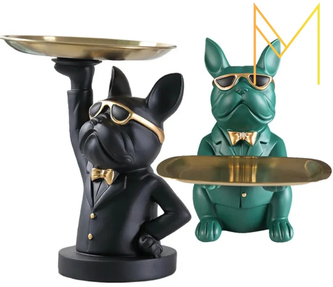 Перед вами не просто статуэтка, а интерьерный персонаж с характером. «Дворецкий-пёс» — это оригинальный органайзер, сочетающий функциональность, харизму и современный дизайн. Он выполнен в форме элегантного французского бульдога в очках и бабочке, держащего на вытянутых лапах поднос. И всё это — в благородных матовых и золотых тонах.