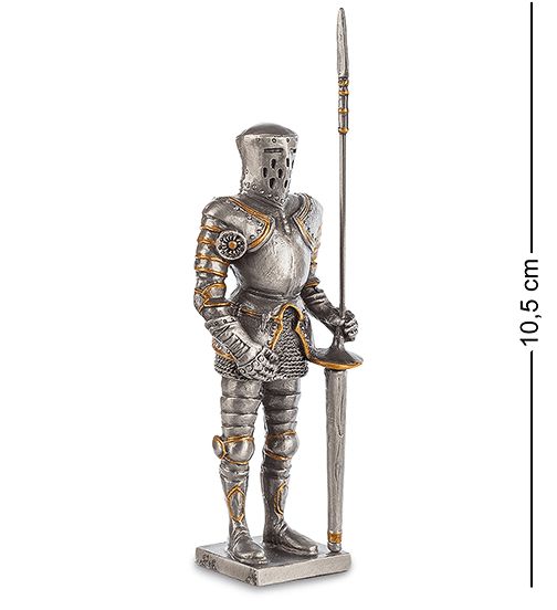 Многие из нас с удовольствием посетили бы рыцарский турнир, хотя бы в роли зрителя, но, увы, их давным-давно не проводят. Зато мы можем предложить статуэтку «Рыцарь с копьем», изображающую средневекового воина в парадном железном костюме. Копье, которое рыцарь держит в руках, оснащено длиной, широкой, необычной формы ручкой, которая придает оружию сходство с самурайским мечом. На голове воина – тяжелый закрытый шлем, а руки, ноги и туловище заключены в кольчугу и тяжелые латы.