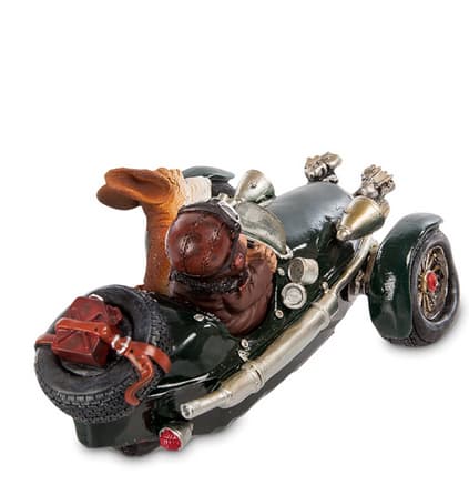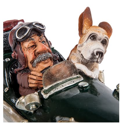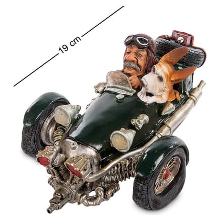 Скільки років цій дивній машині? Схоже, у кілька разів більше, ніж її літньому господареві. Три напівспущені колеса, двигун, що не поміщається під капотом. Чи були взагалі такі машини, чи її довелося збирати за власною фантазією з того, що під руку підвернулося? Але господар задоволений і, посадивши поряд вірну подругу - собаку, вирушив у дорогу. Чудовий подарунок для затятого автомеханіка, здатного зібрати транспорт із нічого.