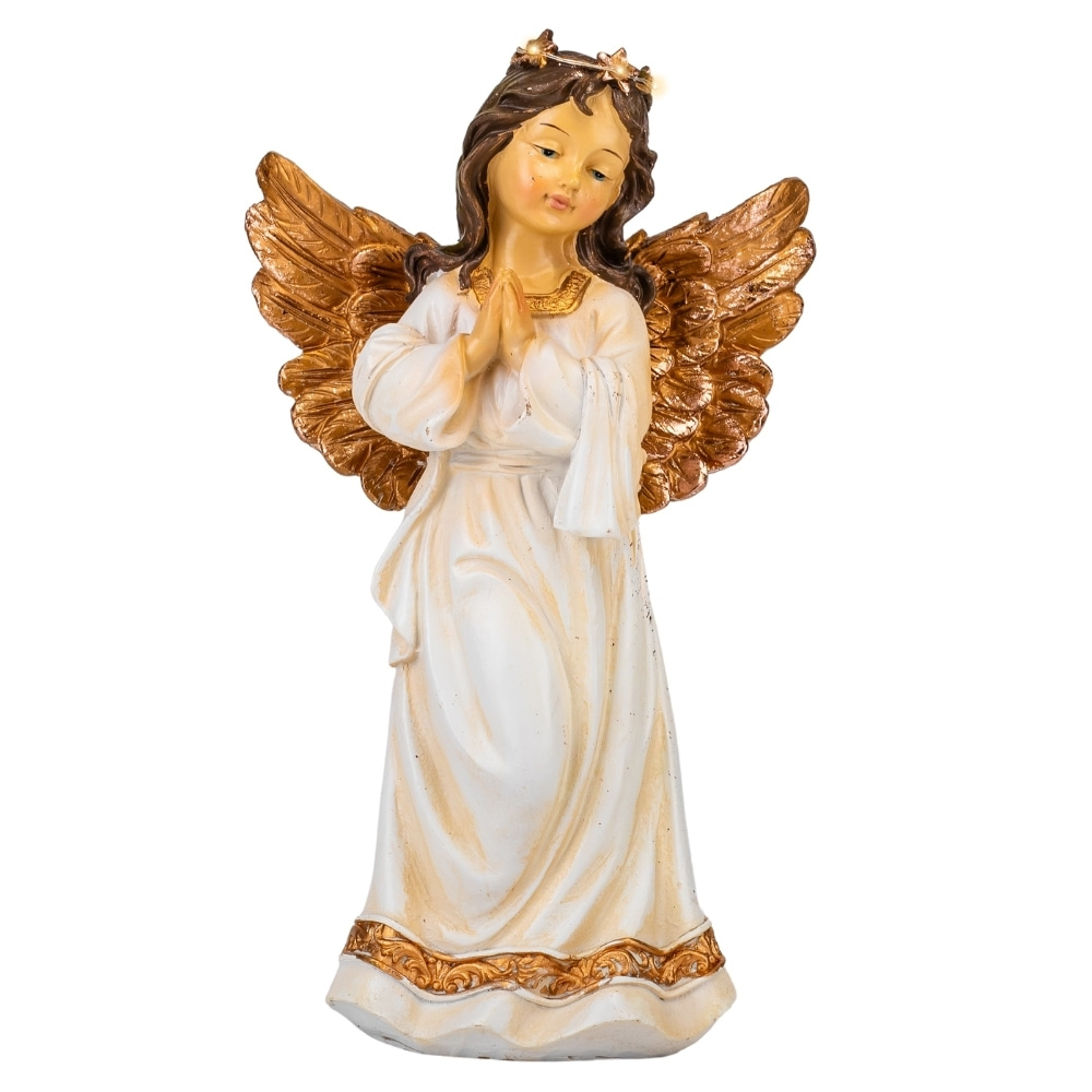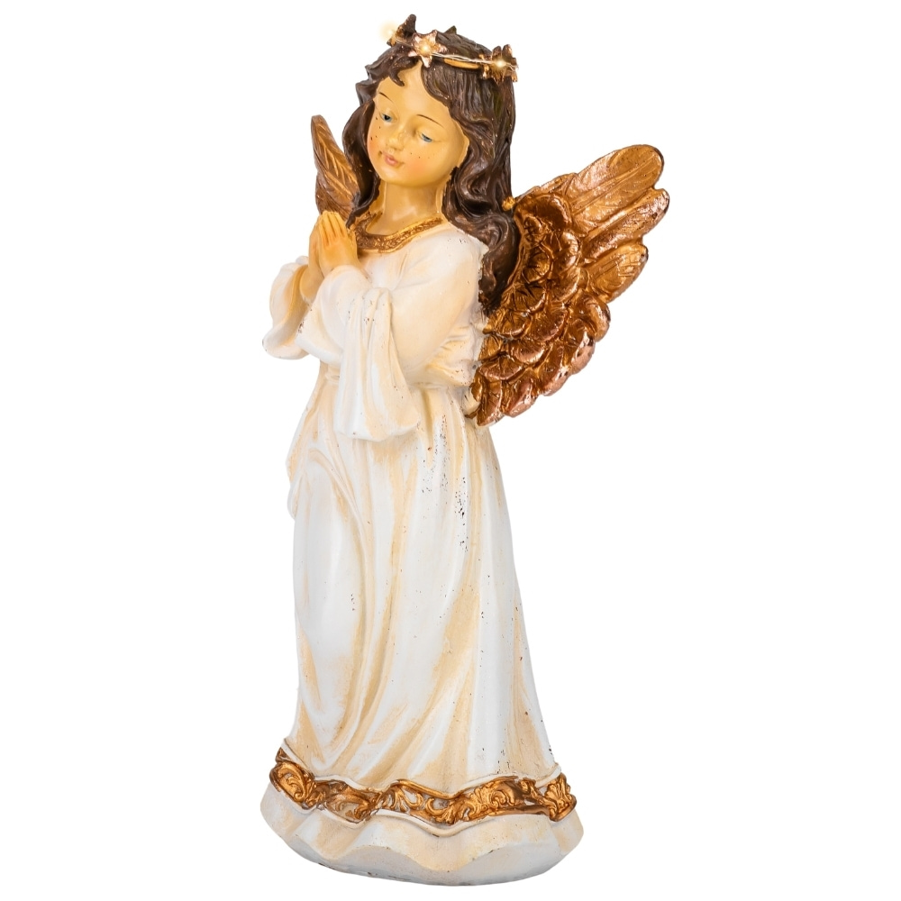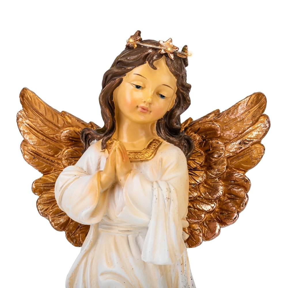 Эта изящная фигура высотой 31,5 см создана, чтобы наполнять пространство теплом, светом и ощущением небесного покоя. Выполненная из прочного и эстетичного полистоуна, статуэтка гармонично сочетает в себе долговечность и элегантность. Нежные золотистые крылья придают образу лёгкость и подчёркивают небесную природу ангела.