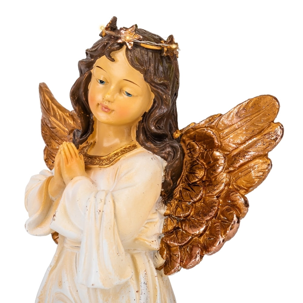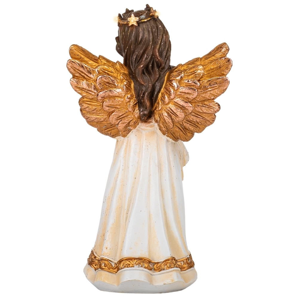 Особое очарование фигуре придаёт светящийся венок на голове. Встроенная подсветка, работающая от двух батареек типа AAA, создаёт мягкое сияние, которое наполняет интерьер уютом, гармонией и умиротворением.