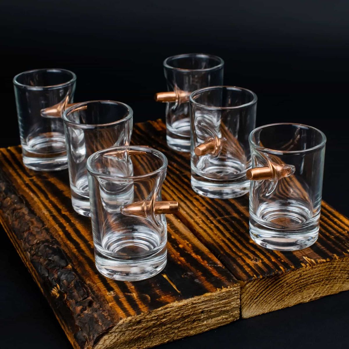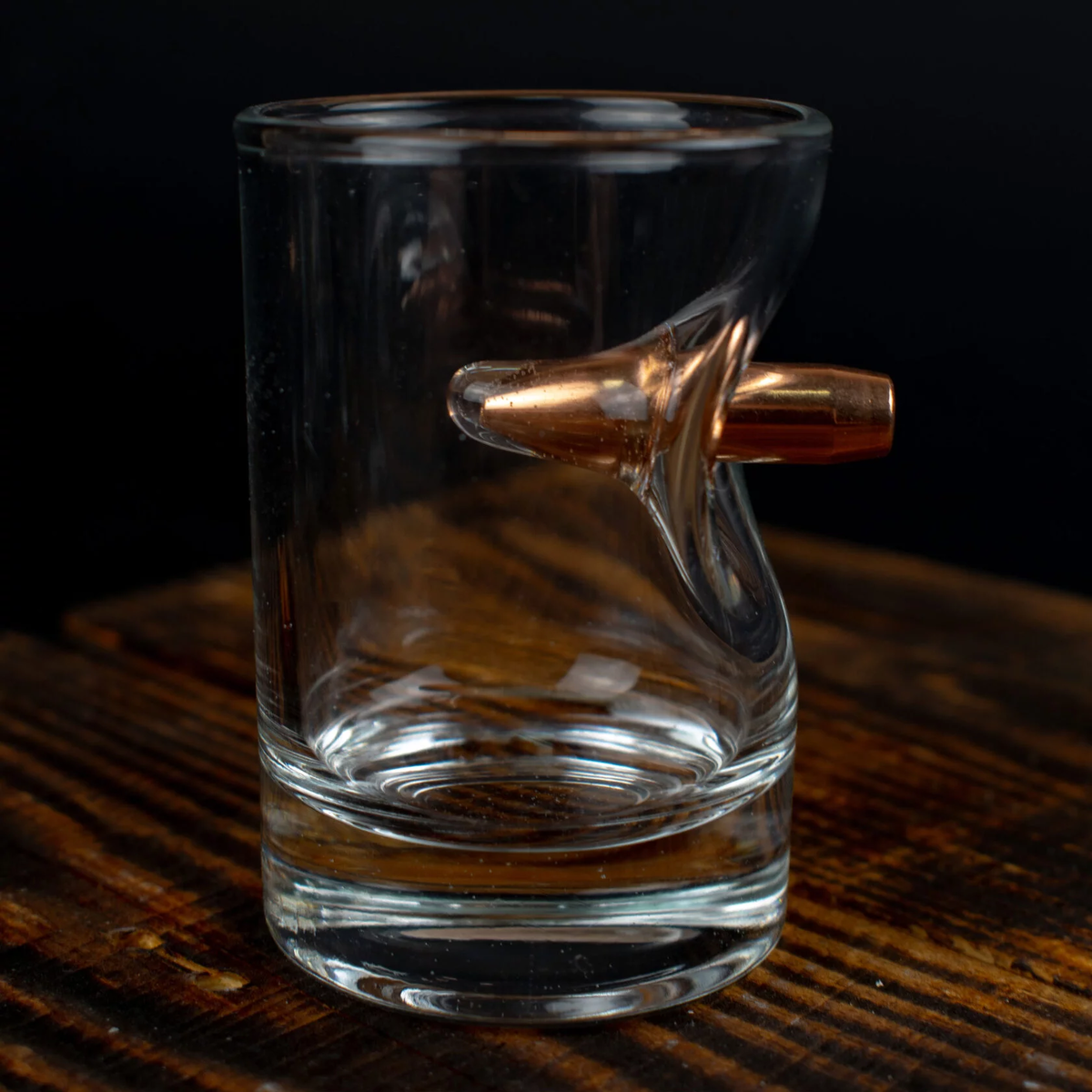Стопка с настоящей пулей 7.62 мм. – это тот подарок, который способен удивить. Пуля, будто выстрелом пробивает стекло и останавливается в нем, выглядит красиво и совершенно.