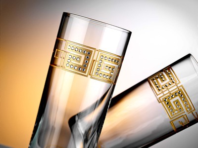 Рисунок нанесен вручную мастерами стекольной мастерской, имеющей вековую традицию. Рисунок сделан с применением золотой фольги. Кристаллы Swarovski.