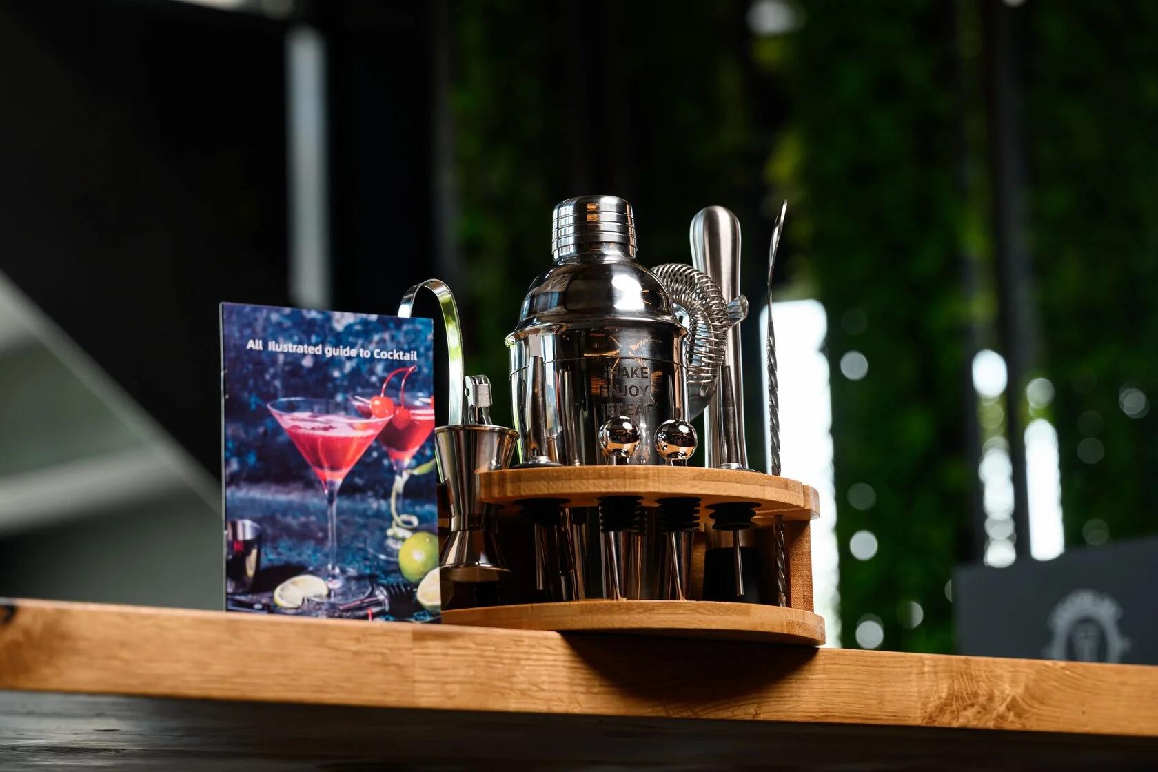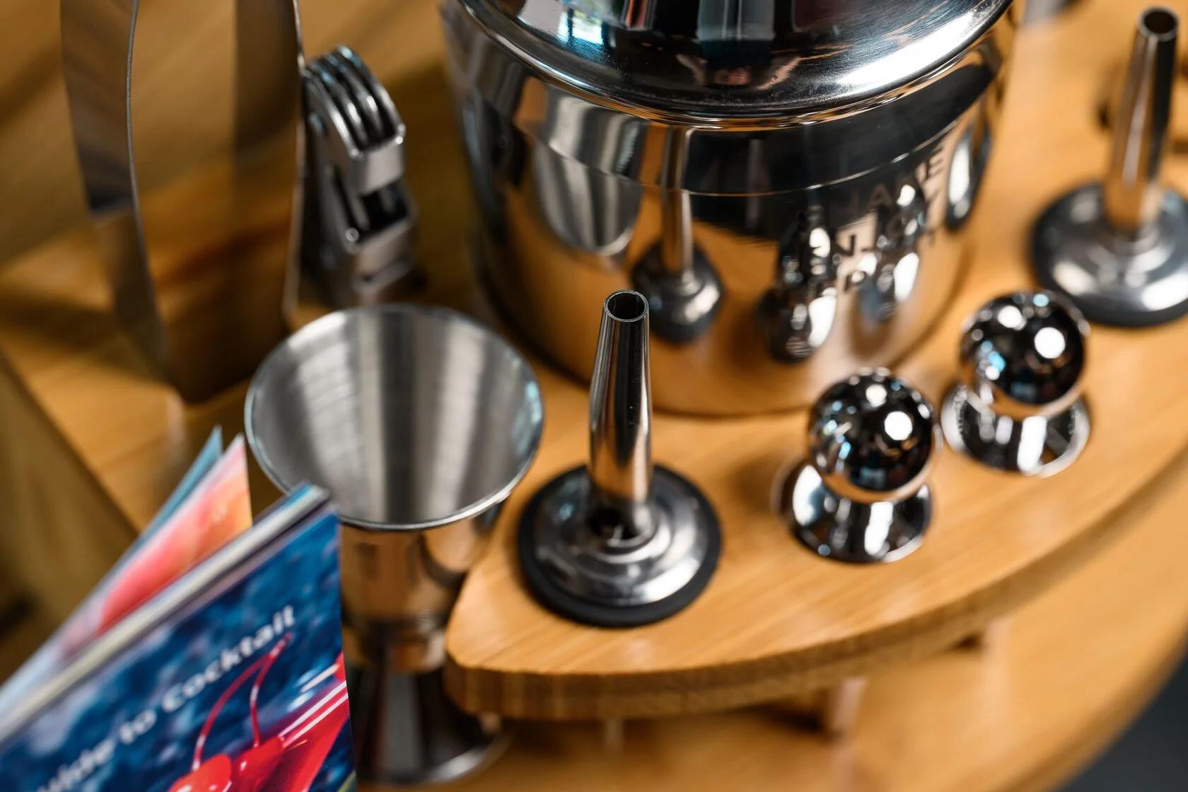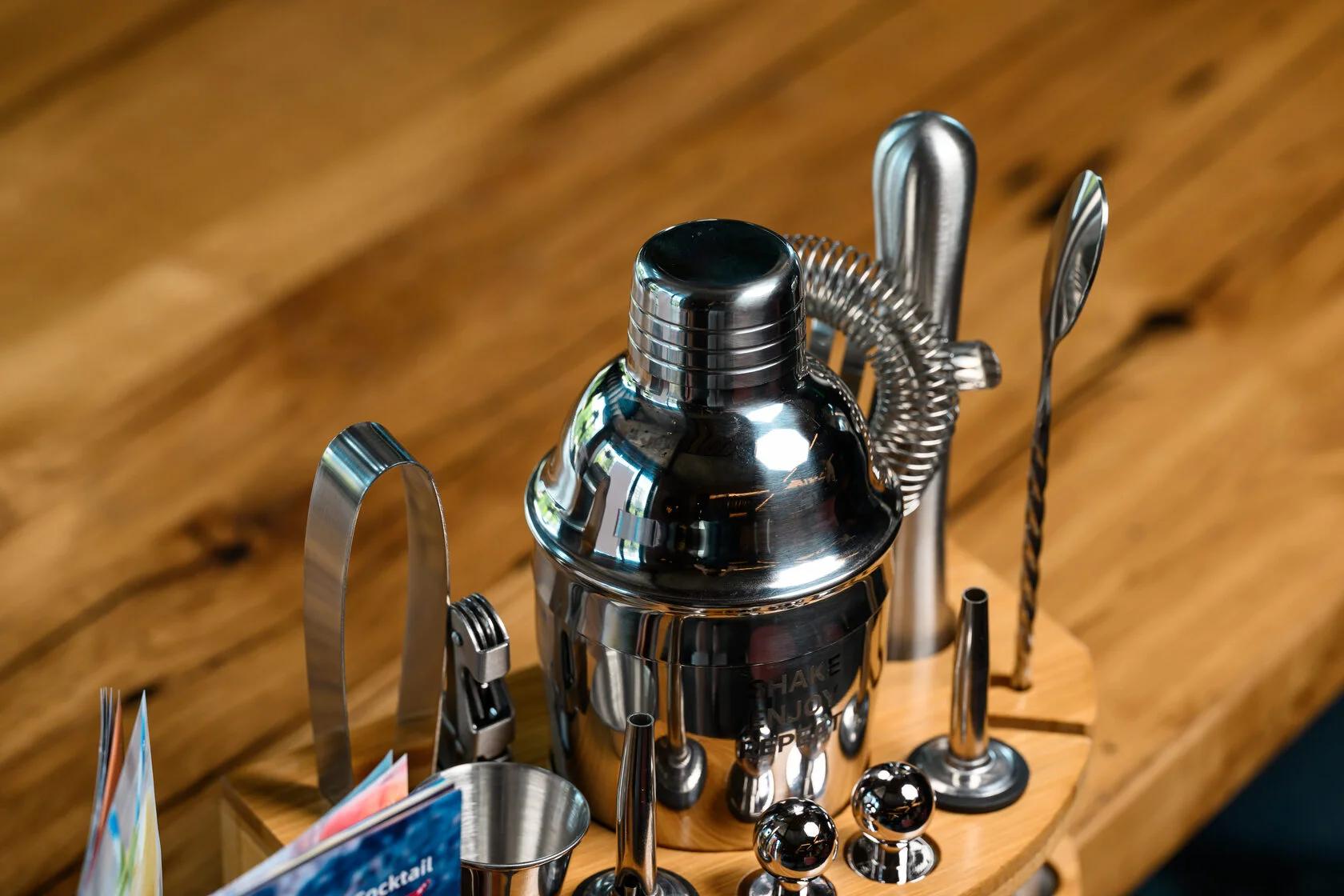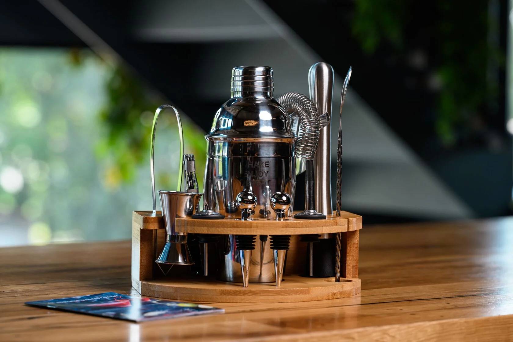 В комплект входят 11 предметов, необходимых для создания идеальных коктейлей: вместительный шейкер 600 мл, двойной джиггер на 15/30 мл, два гейзера, стопперы, щипцы для льда, мадлер, барная ложка, штопор и барное ситечко. Всё изготовлено из прочной нержавеющей стали, приятной на ощупь и роскошно смотрящейся на фоне теплого дерева. С таким набором вы сможете почувствовать себя барменом элитного заведения, не покидая собственного дома.