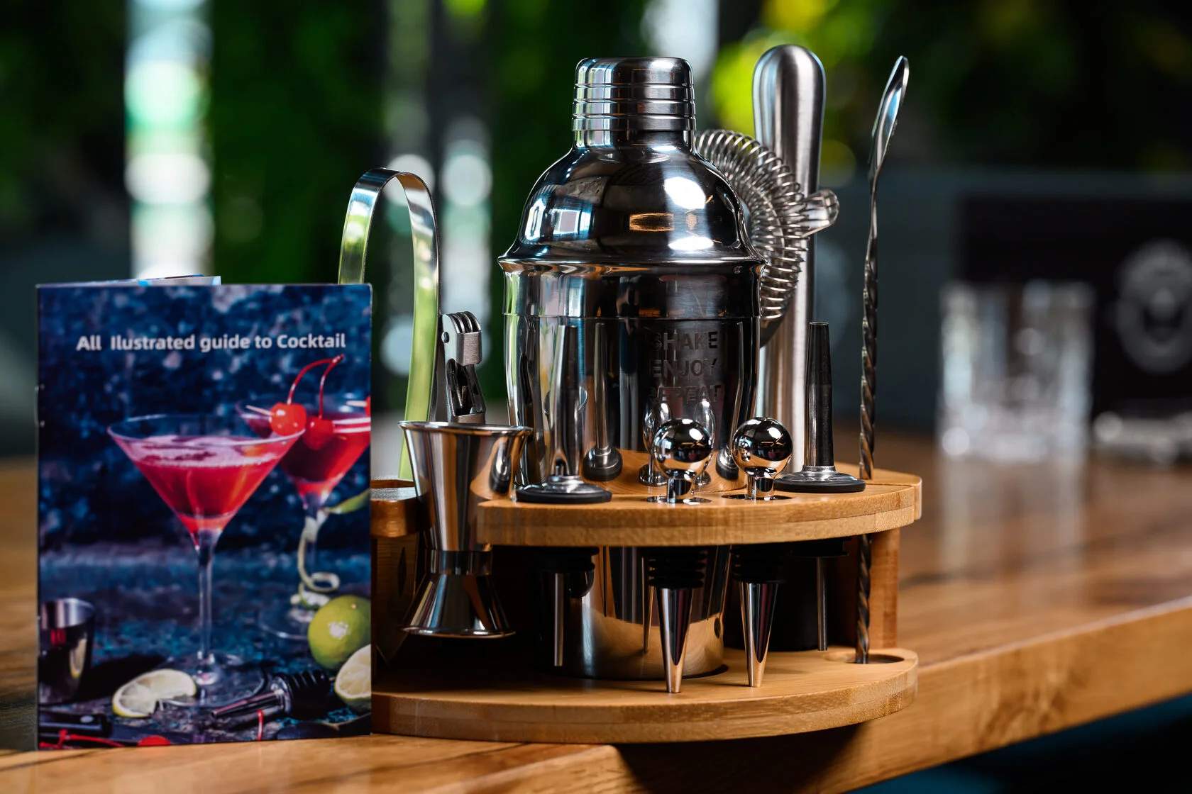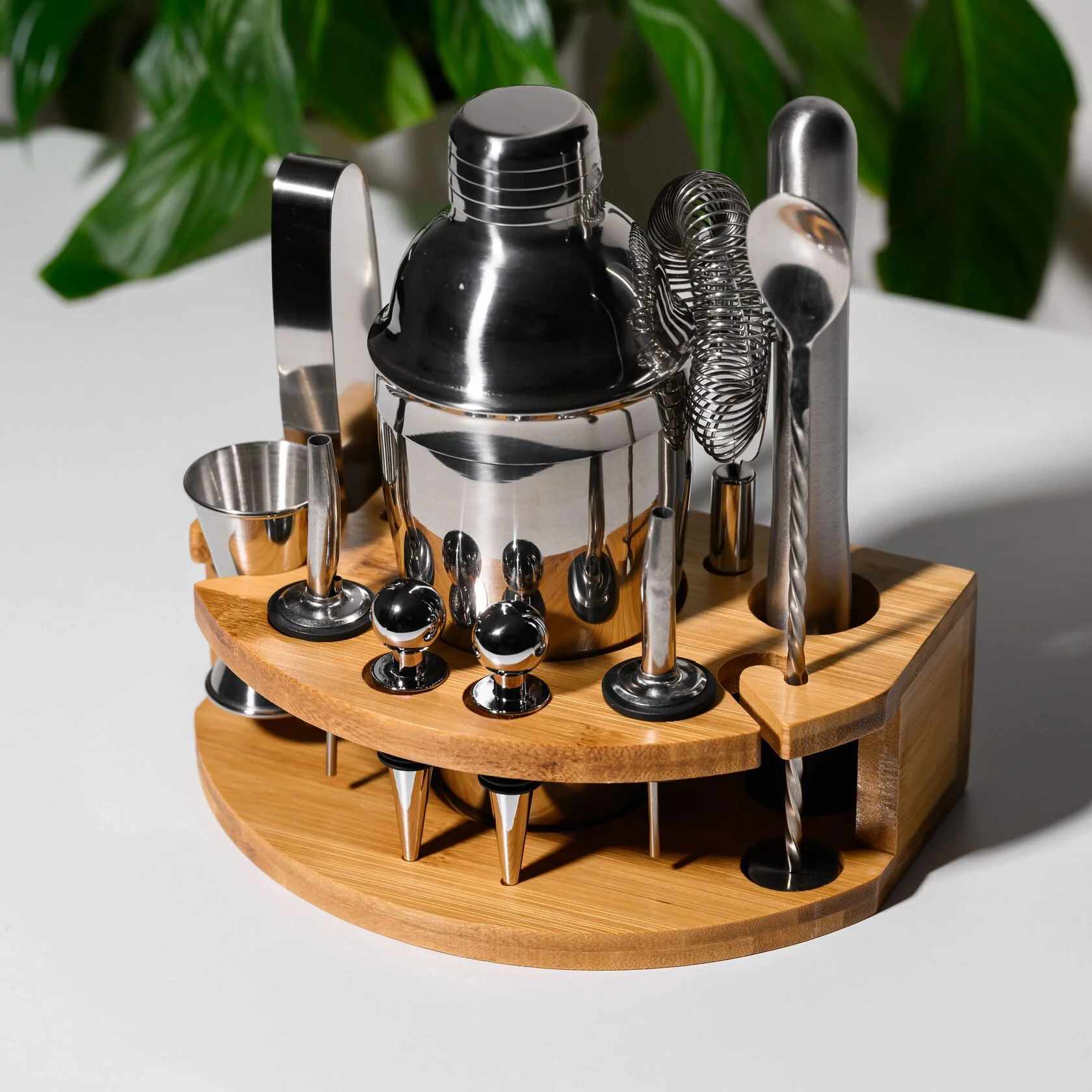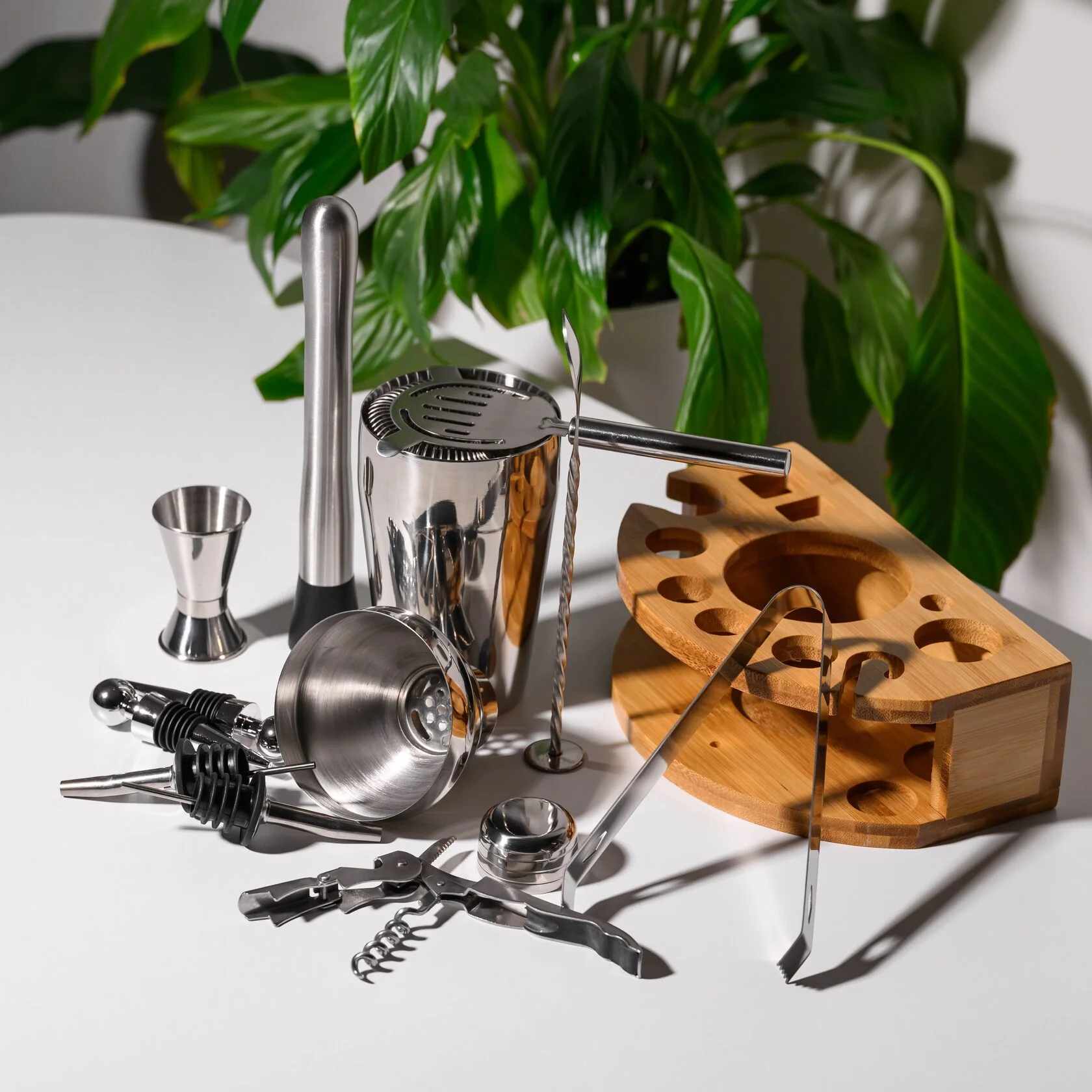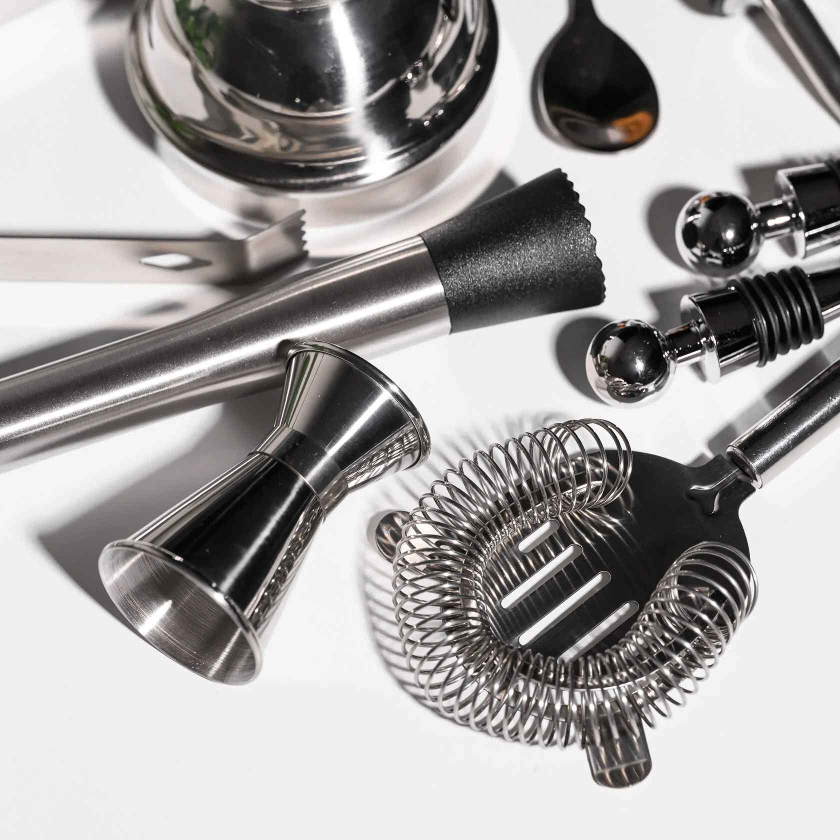 В комплект входят 11 предметов, необходимых для создания идеальных коктейлей: вместительный шейкер 600 мл, двойной джиггер на 15/30 мл, два гейзера, стопперы, щипцы для льда, мадлер, барная ложка, штопор и барное ситечко. Всё изготовлено из прочной нержавеющей стали, приятной на ощупь и роскошно смотрящейся на фоне теплого дерева. С таким набором вы сможете почувствовать себя барменом элитного заведения, не покидая собственного дома.