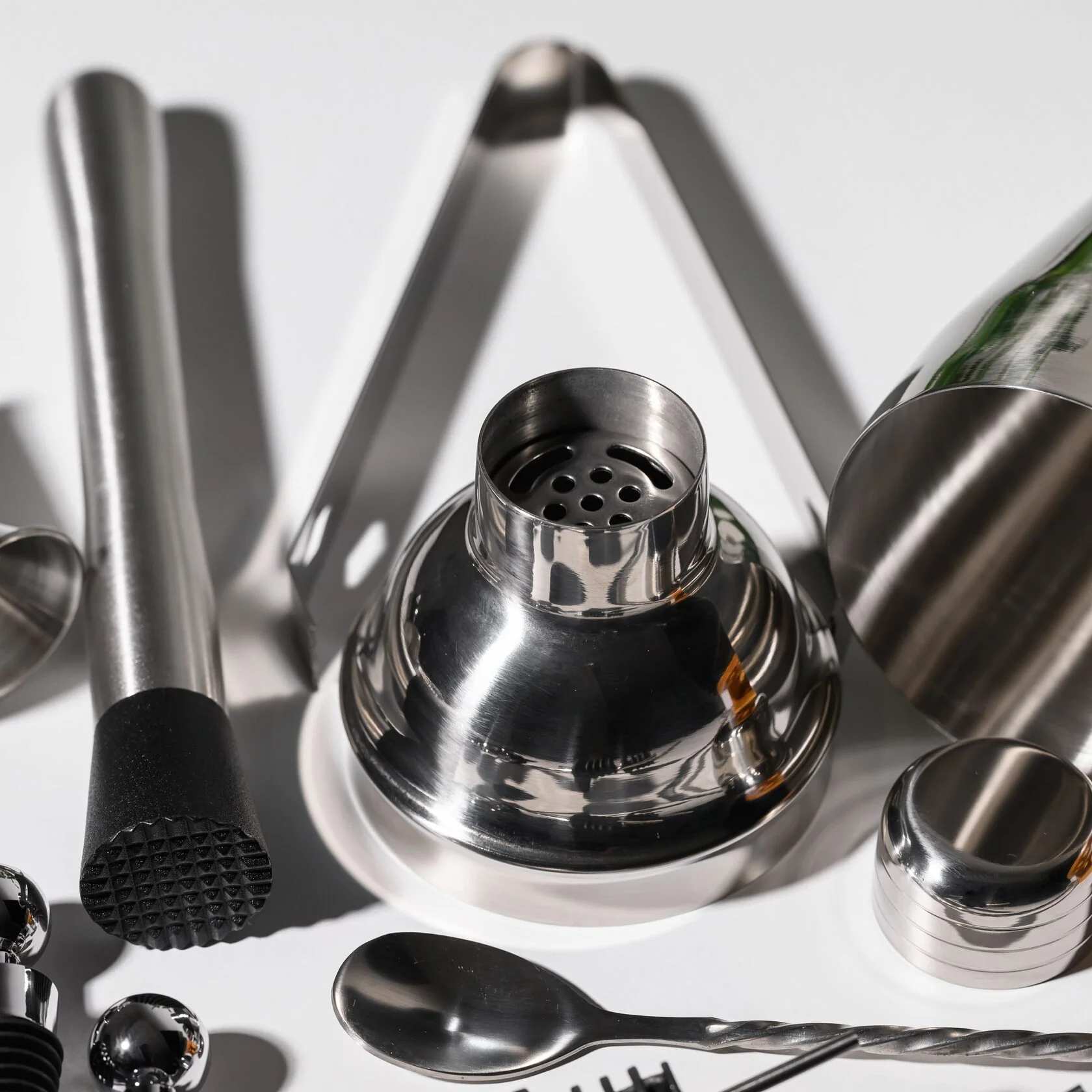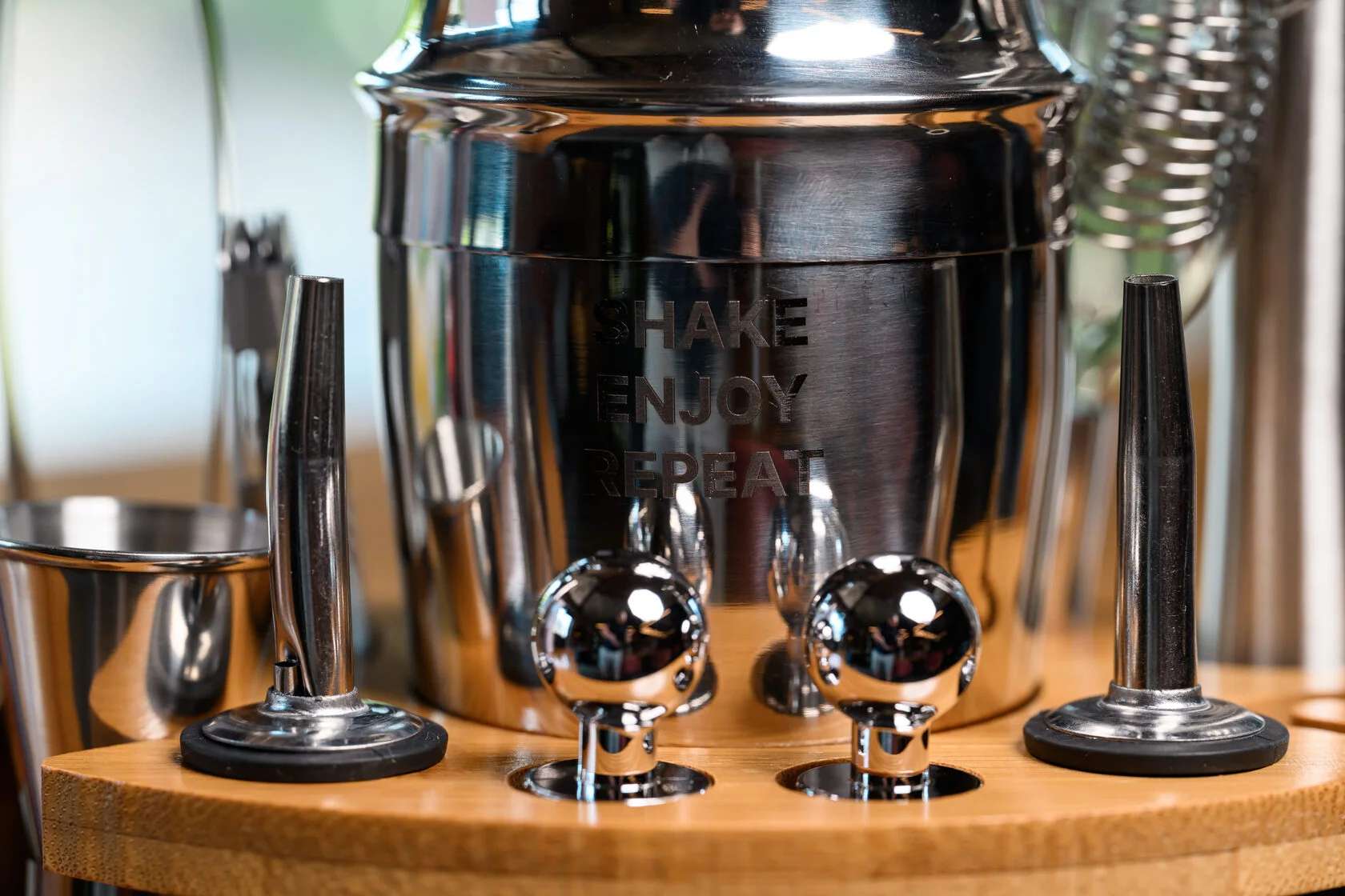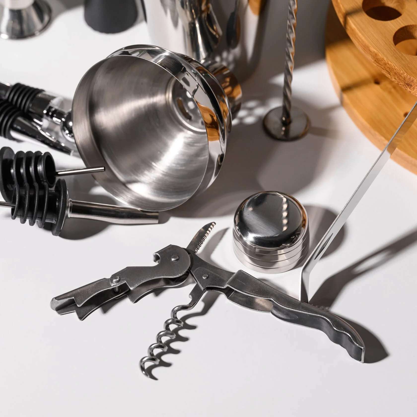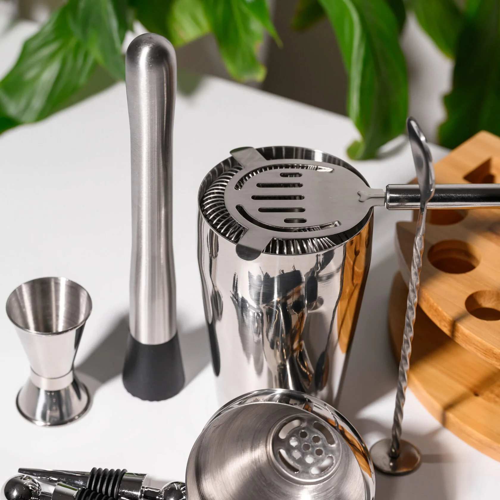 В комплект входят 11 предметов, необходимых для создания идеальных коктейлей: вместительный шейкер 600 мл, двойной джиггер на 15/30 мл, два гейзера, стопперы, щипцы для льда, мадлер, барная ложка, штопор и барное ситечко. Всё изготовлено из прочной нержавеющей стали, приятной на ощупь и роскошно смотрящейся на фоне теплого дерева. С таким набором вы сможете почувствовать себя барменом элитного заведения, не покидая собственного дома.