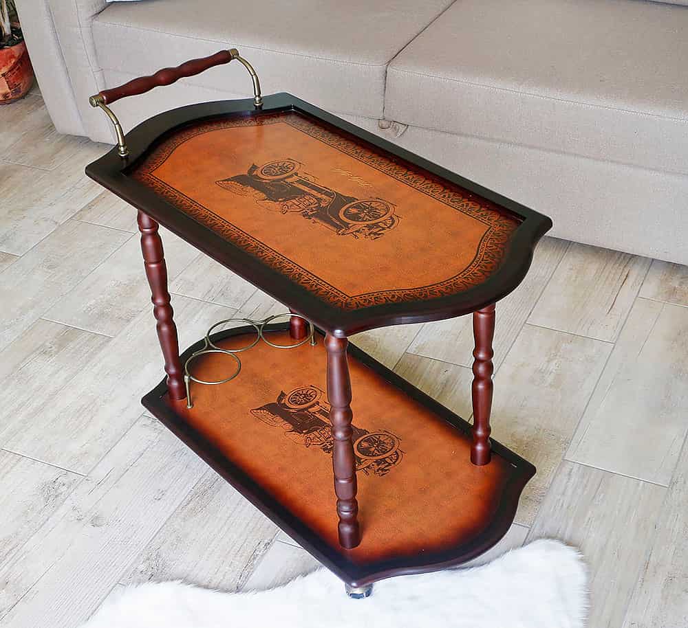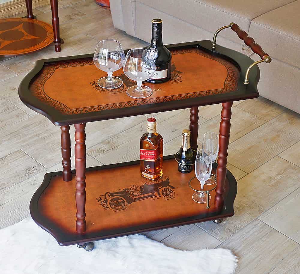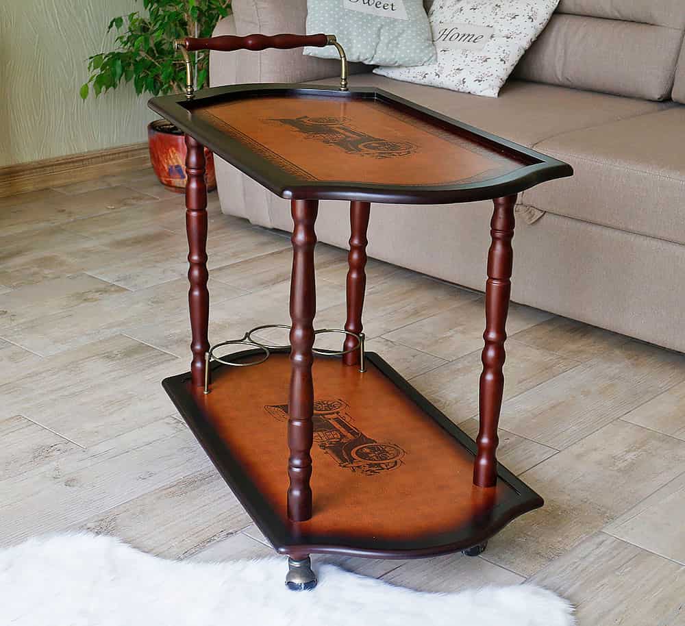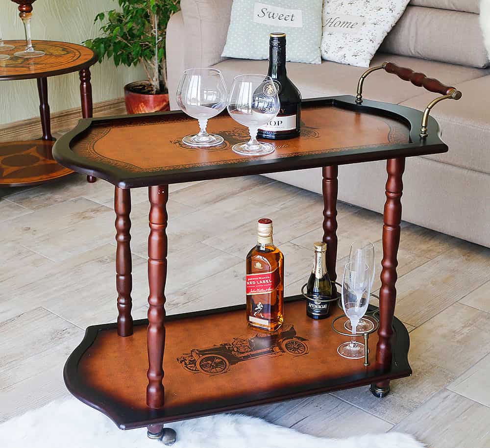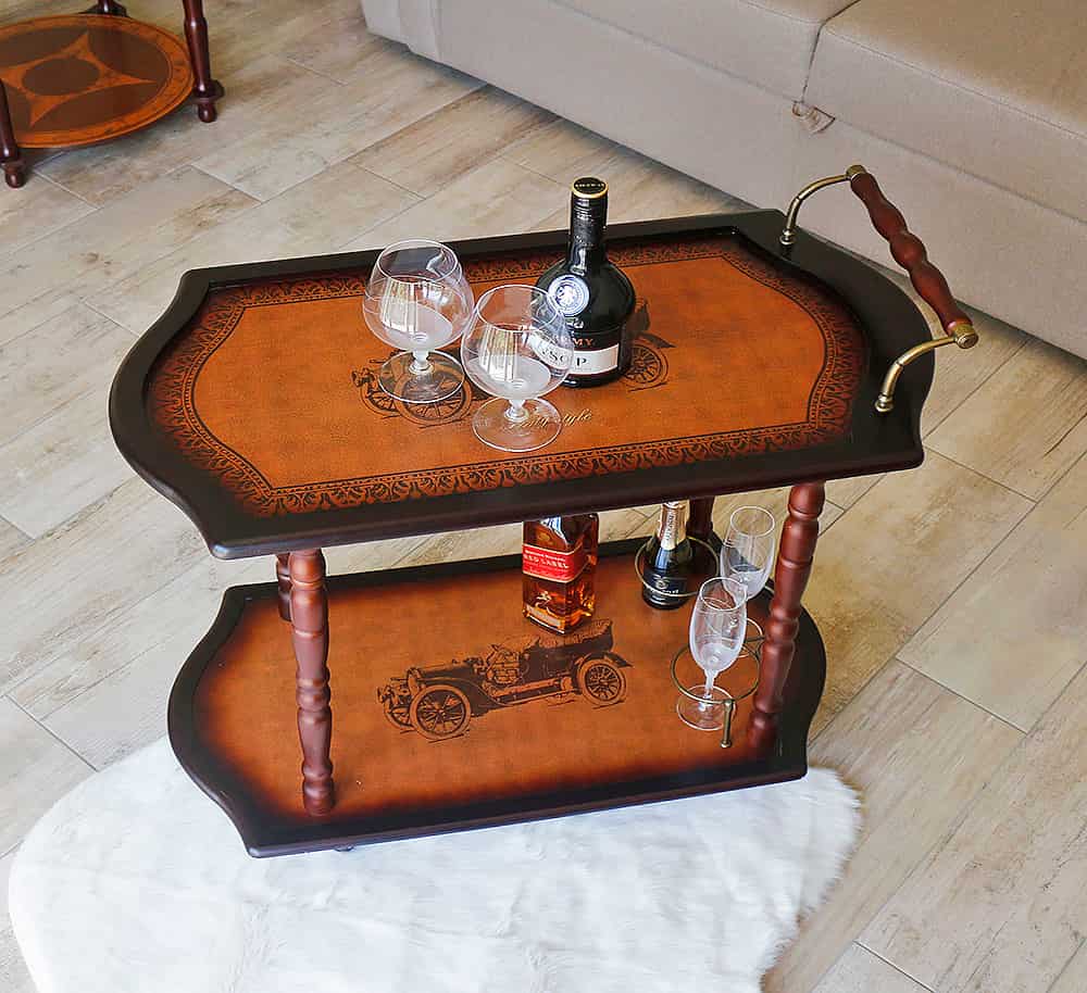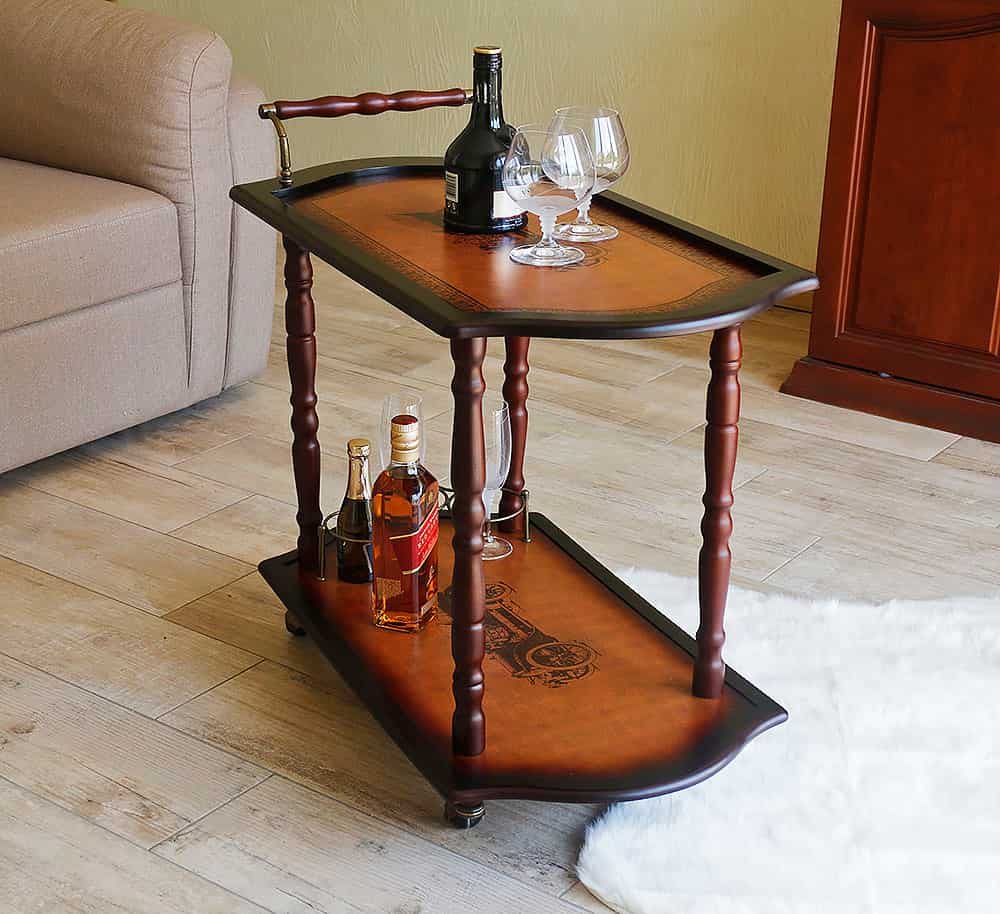 Столик – бар прямокутний виготовлений із дерева. Оснащений столик поличкою, відділеннями для пляшок 3шт. і колесами, що дозволить легко переміщати його в будь-яке зручне місце.