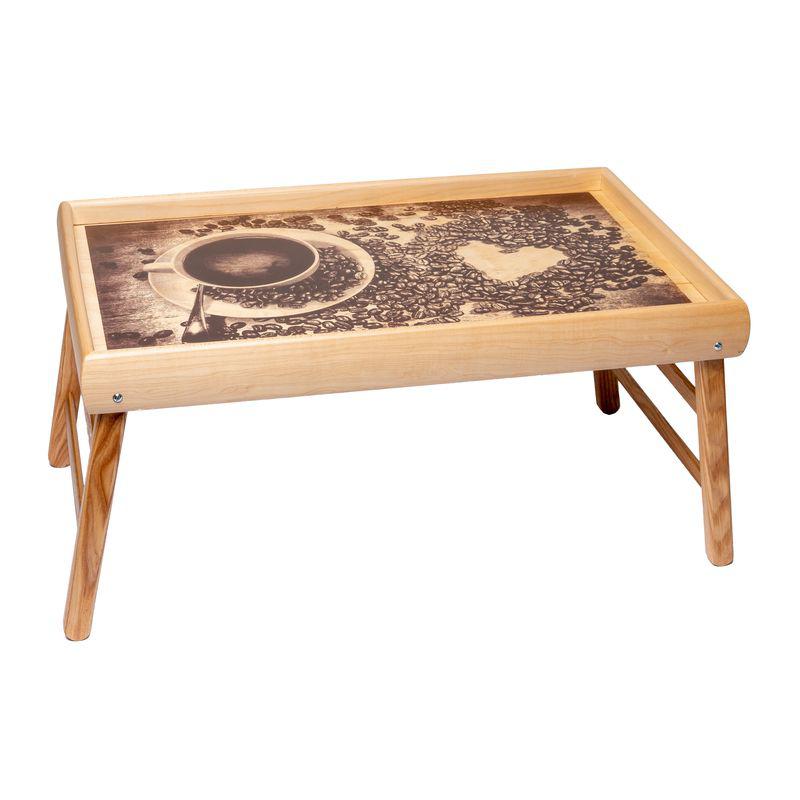 Материал столешницы: мебельная фанера, толщиной 4 мм. Полезная информация! Преимущества: Столик для завтрака в постель легкий, не громоздкий, устойчив. Ему не страшны кипяток, горячие предметы. Рисунок нанесен современным методом шелкотрафаретной печати непосредственно на МДФ и покрыт лаком, что делает его износостойким и долговечным. Немного выступающие бортики не дают поставленной на столик посуде опрокинуться. Качественно собран. Натуральные материалы. Никакого китайского пластика! Очень стилен, красив. Украсит любой интерьер. Ножки складываются во внутрь снизу. Плотно прилегают к борту и не выпадают самовольно при поднятии подноса. Лучшего соотношения цены и качества не найти. Покупая столик для завтрака в постель вы сохраните постель, кровать, диван чистым, убережете квартиру от крошек (возможно избежите нагоняя:)). Поверхность, кстати легко вытирается ? у пятен нет шансов! Широкий спектр практического применения. Кроме использования столика для подачи еды, его можно использовать как подставку под ноутбук. Можно брать с собой на пикник, в долгую дорогу на автомобиле, в сауну или баню. Можно покормить ребенка (например поставить смесь, водичку, положить рядом полотенце). Столик купить это значит не только приобрести хорошую, добротную вещь, а значит и поддержать украинского производителя, обеспечить работой достойных уважения мастеров своего дела.