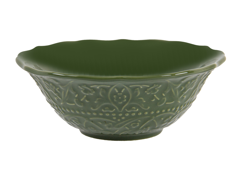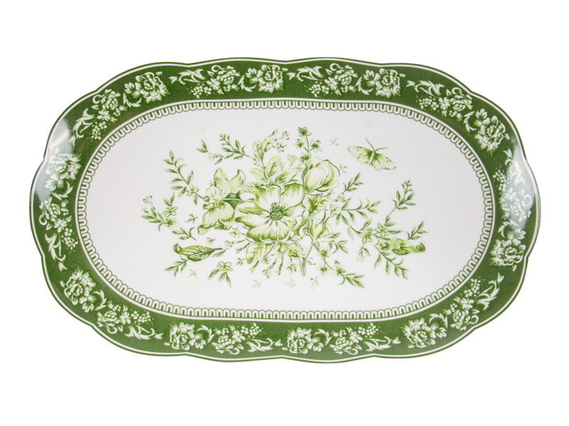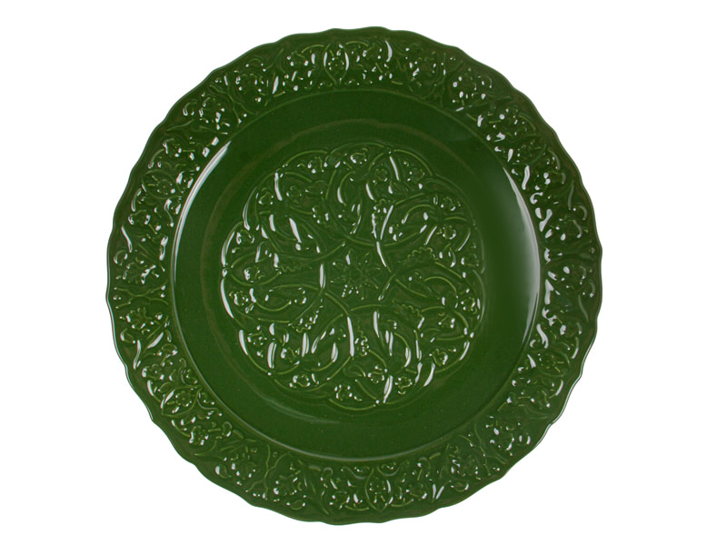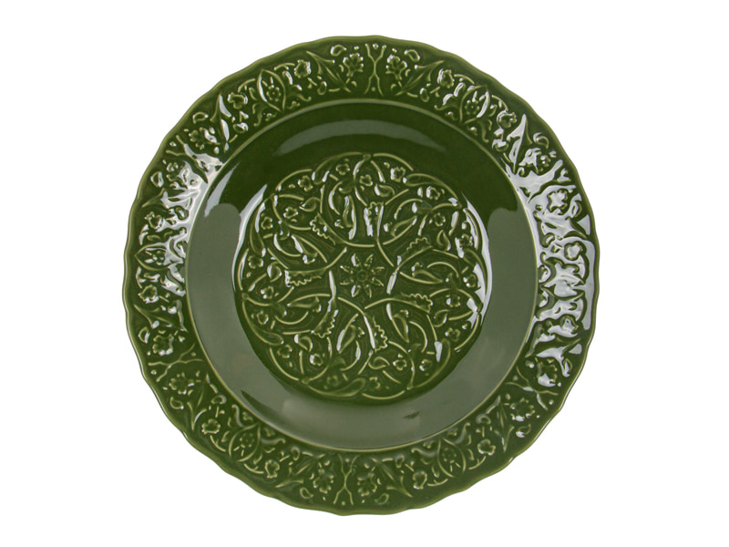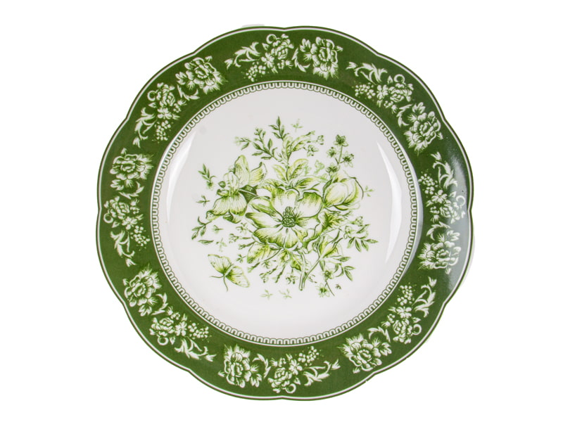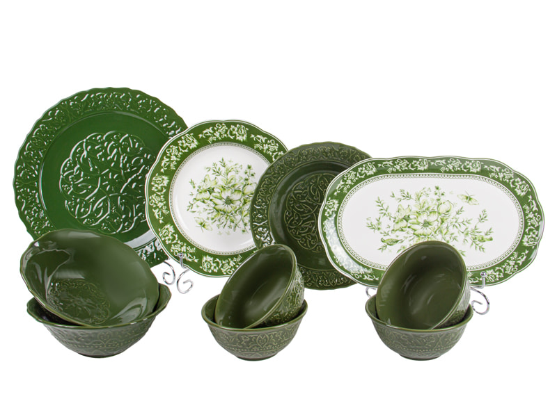 Вишуканий столовий набір з фарфору у класичному вінтажному стилі. Глибокий зелений колір і флористичний візерунок створюють атмосферу елегантної сервіровки, а рельєфні елементи додають декоративності та виразності. Підходить для щоденного використання й святкового столу, легко поєднується з білим та кольоровим посудом.