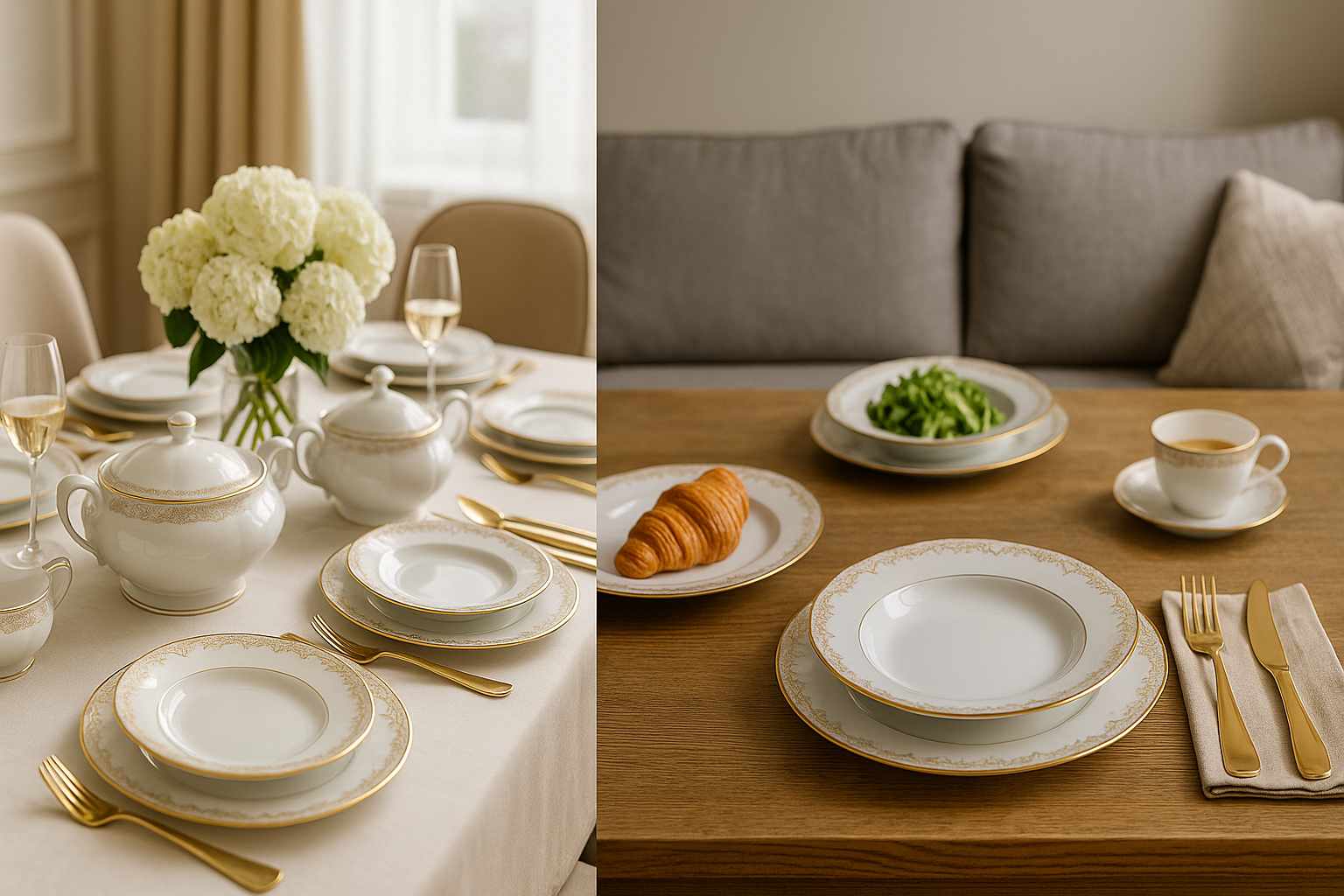 - Святкові розкішний або навіть екстравагантний декор золотом, насичені візерунки. Може бути складніше у догляді. Створює святкову атмосферу урочисті застілля.