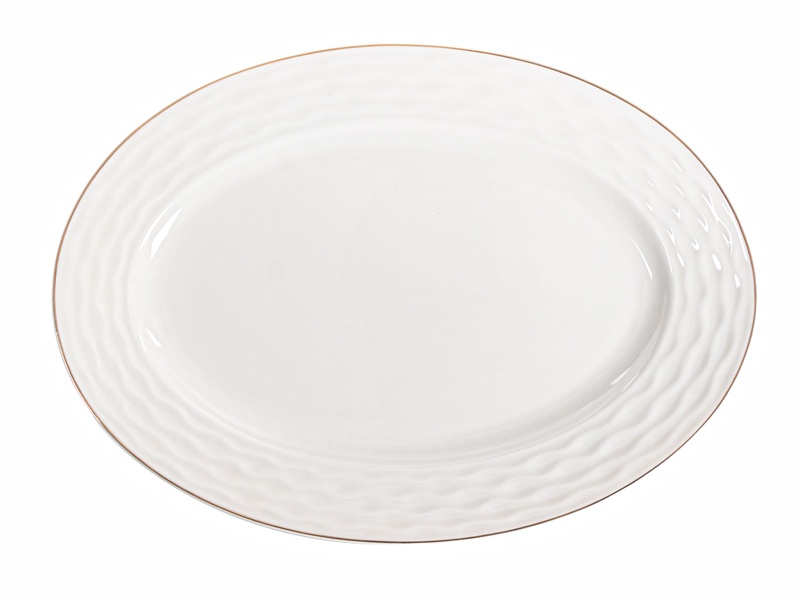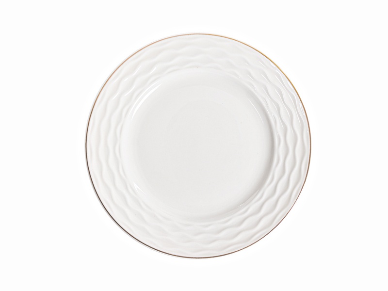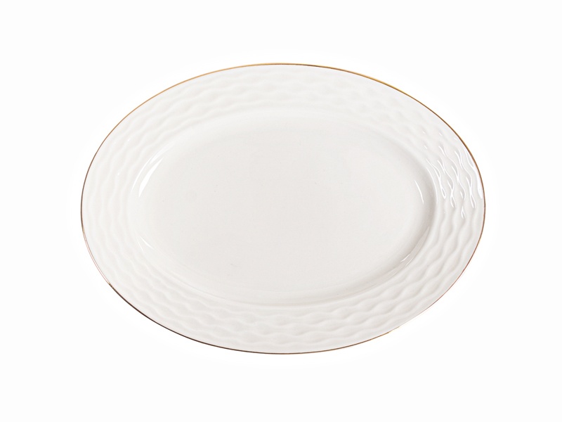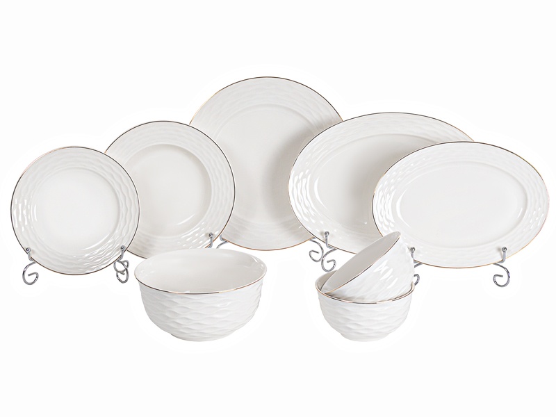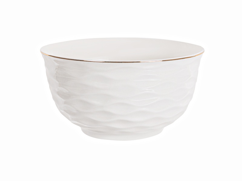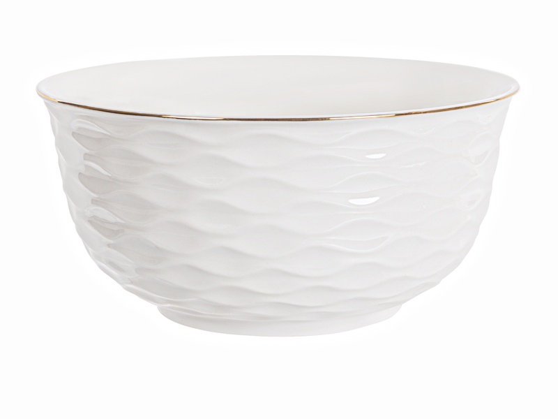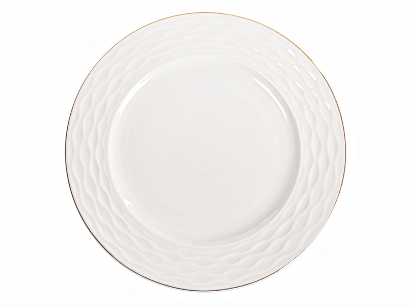 Каждое изделие коллекции выполнено из качественного фарфора с деликатной текстурой и мягкой волнообразной формой. Лёгкое сияние золотой линии добавляет праздничный акцент, не перегружая композицию. Посуда выглядит торжественно, но при этом сохраняет лаконичность и спокойный стиль.