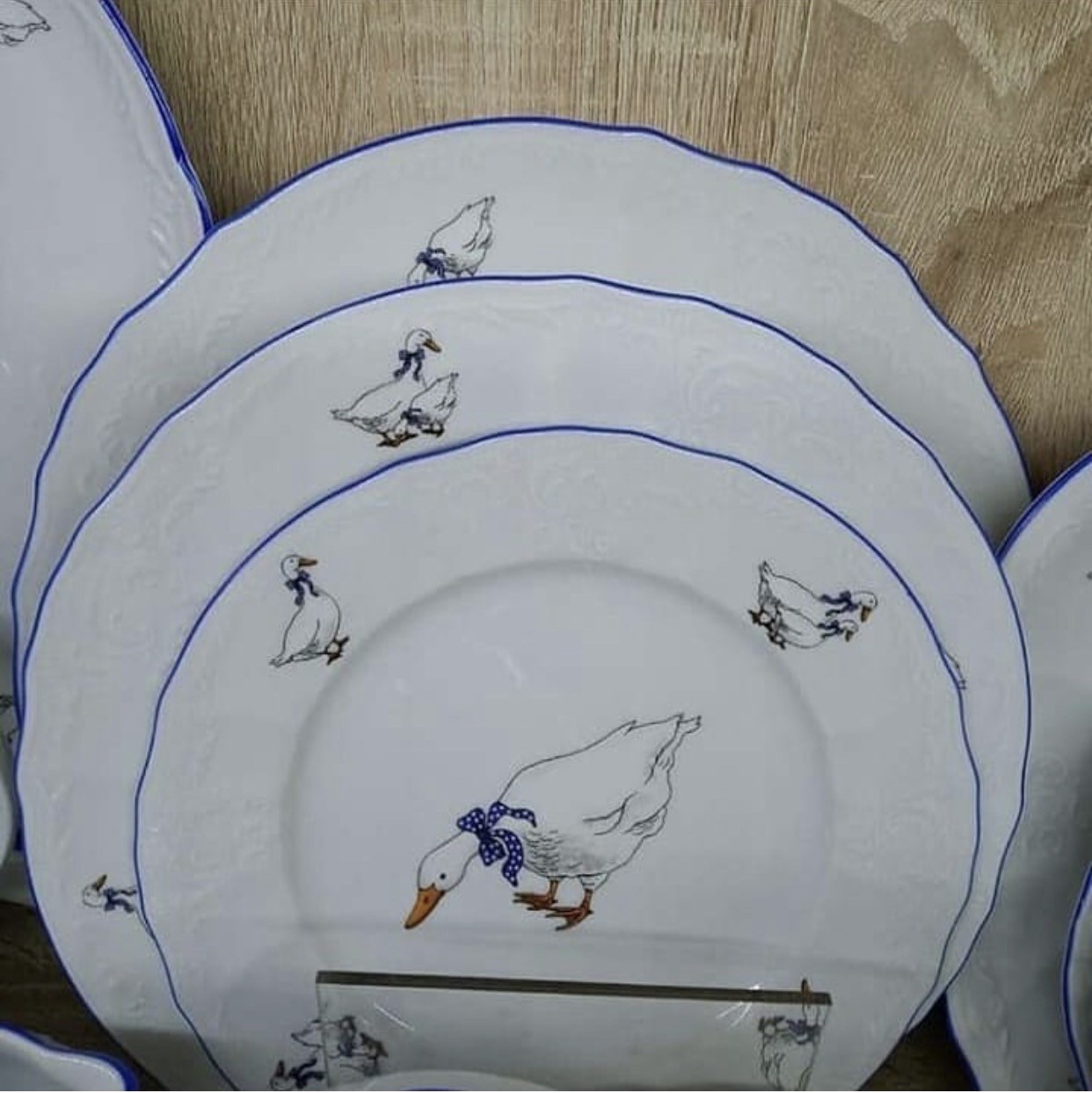 Оригинальный чешский столовый сервиз 24 предметов на 6 персон декор "Гуси" синяя кайма