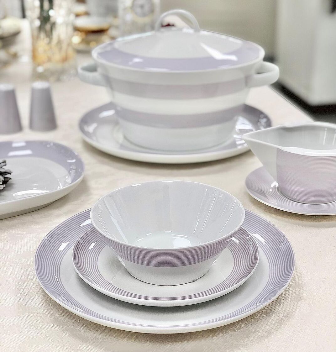 Высококачественный фарфор белого цвета с нежно фиолетовыми полосками. Его прочная структура и устойчивость к сколам позволяет пользоваться данной посудой каждый день. Фарфор чешского производителя Thun всегда будет выглядеть на Вашем столе элегантно и в тоже время нарядно и торжественно. Высокое качество продукции «Thun» достигается многовековым опытом в производстве фарфора. Использование самых современных технологий позволяет производить изделия различных размеров и форм.
