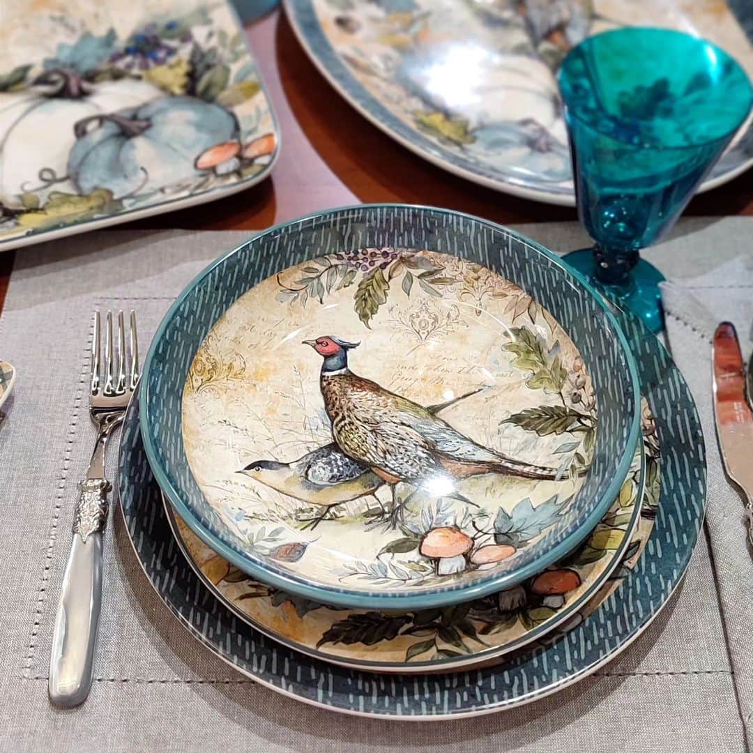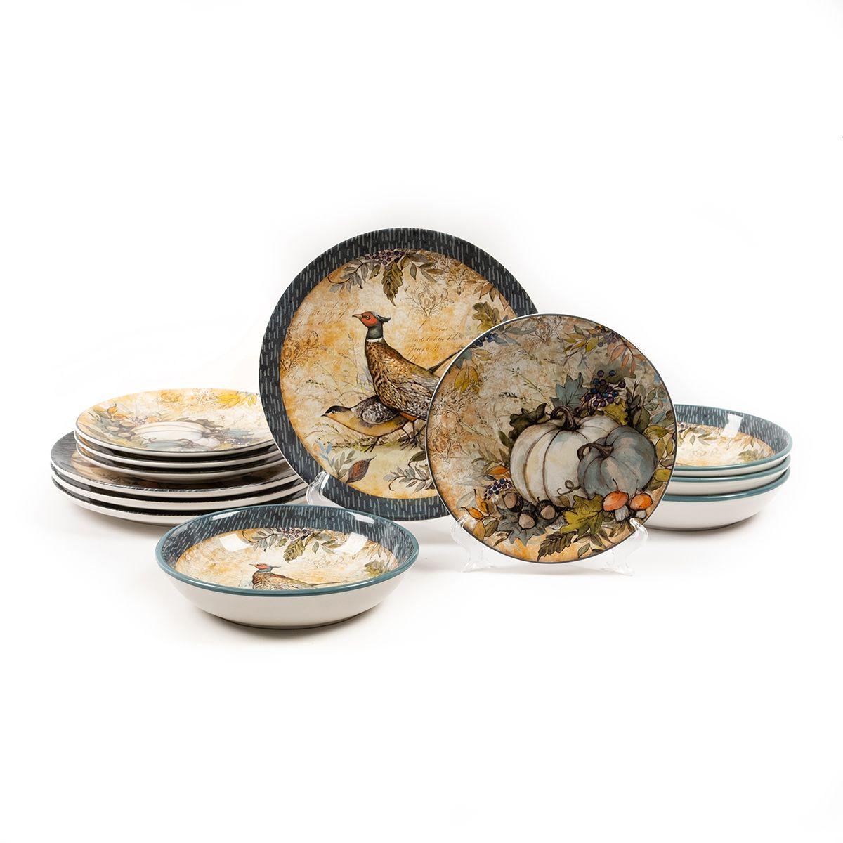 Большинство блюд и тарелок коллекции, в которую также включены кружки, пиалы, салатники и голубой соусник в виде тыквы, расписаны вручную и украшены красивым дизайном приглушенных тонов, что напоминает естественную окраску фазанов, ставших главными героями сета. Птицы с ярким оперением замерли в изящных позах, окруженные венком, состоящий из тыкв, грибов, ягод, желудей, листьев и других атрибутов осени. Некоторые изделия украшены сдержанными осенними натюрмортами, винтажный вид которым придают едва заметные надписи и отпечатки.