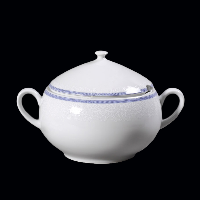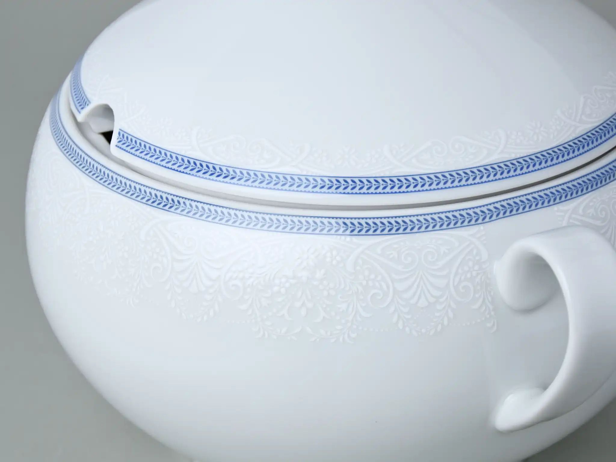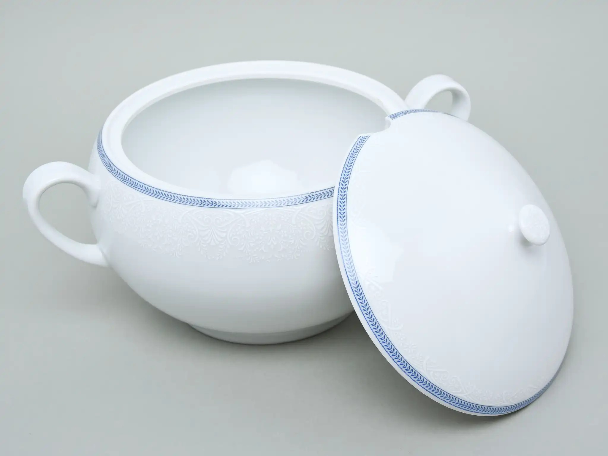 С первого взгляда эта супница из коллекции Thun Opal покоряет своей изысканностью. Она словно создана для того, чтобы стать главным героем вашего обеденного стола. Белоснежный фарфор, украшенный тонким рельефным узором и обрамлённый изящной голубой каймой, выглядит благородно и легко, как дыхание утреннего ветра. Каждый элемент её дизайна — от мягких изгибов ручек до классической формы крышки — продуман до мелочей.