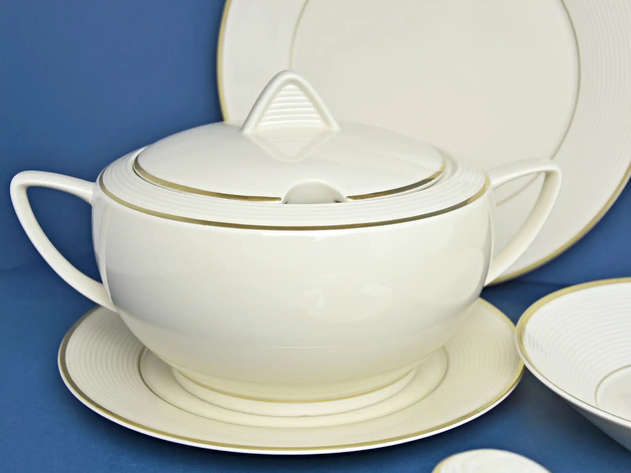 Эта элегантная супница от чешского бренда Thun — воплощение утончённого стиля и безупречной функциональности. Её мягкий оттенок слоновой кости в сочетании с тонким золотым кантом создаёт ощущение аристократичности и тепла. Объем 2.7 литра — идеален для подачи супов, бульонов и даже рагу на праздничный или семейный обед.