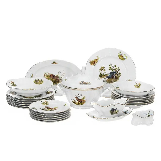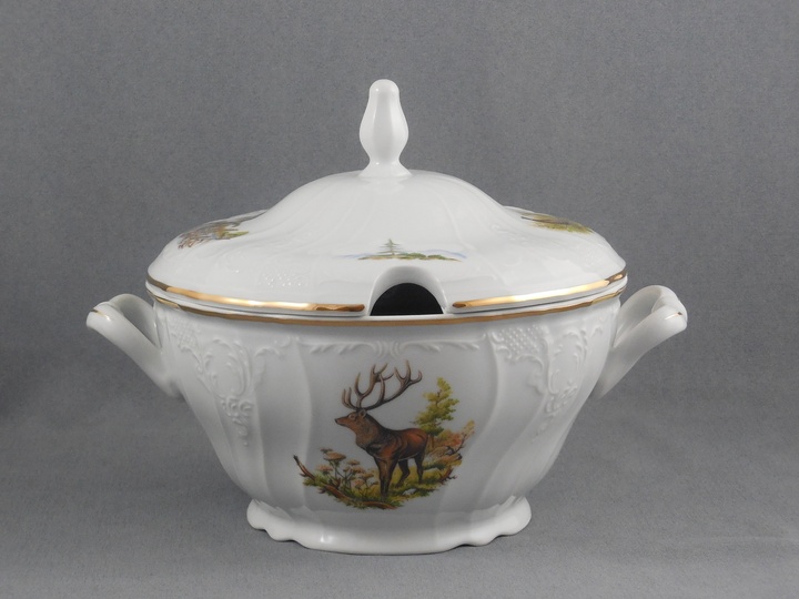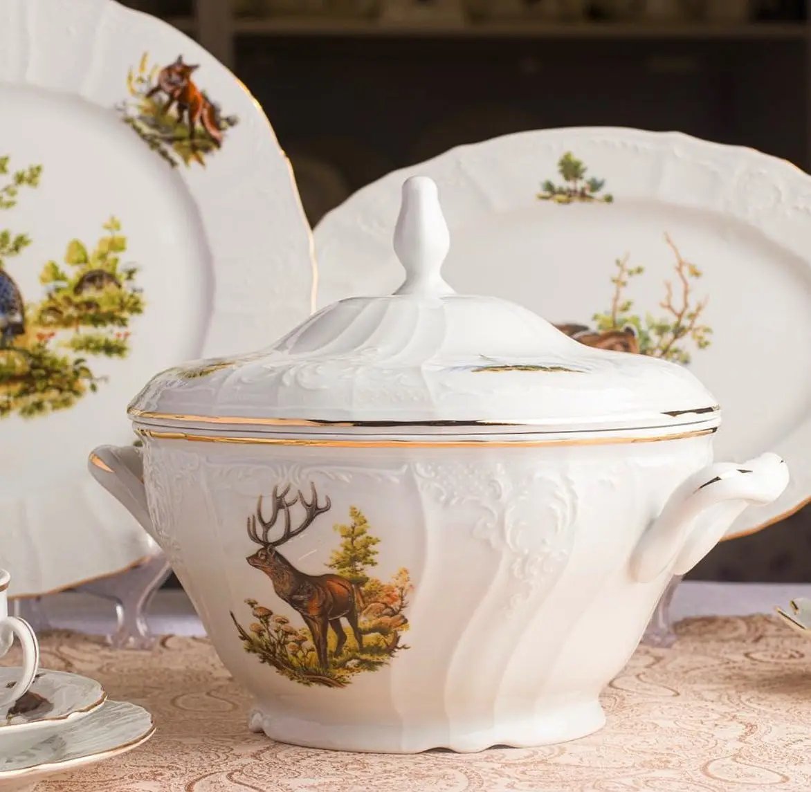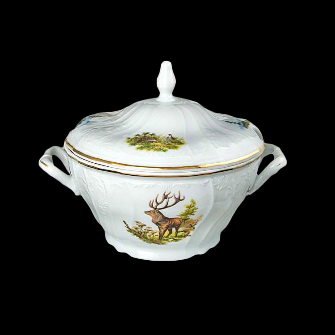 Белоснежный фарфор украшен изысканным рисунком в охотничьем стиле — благородный олень, лесной пейзаж, тонкий золотой кант по краю. Все элементы выдержаны в классике и идеально впишутся в интерьер кухни или столовой с традиционным характером. Такая супница — это нечто большее, чем утварь, это часть семейных традиций и теплых воспоминаний.