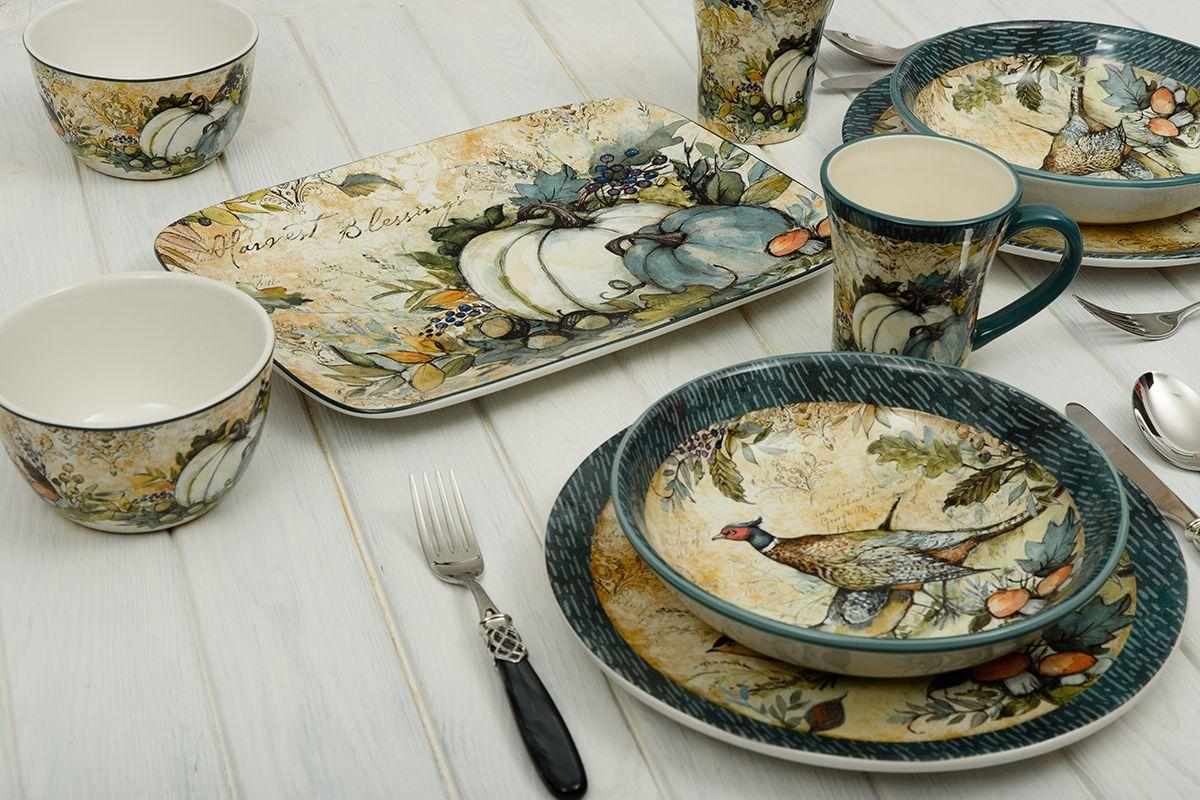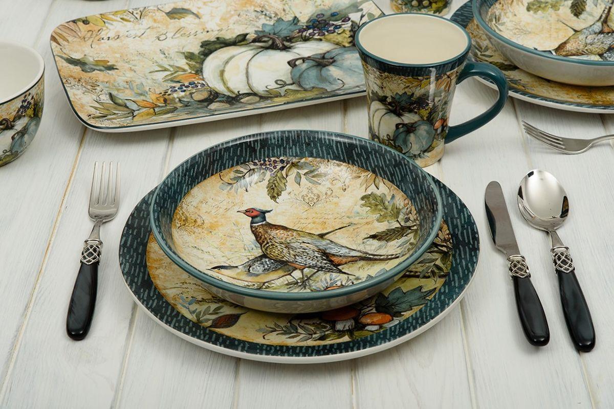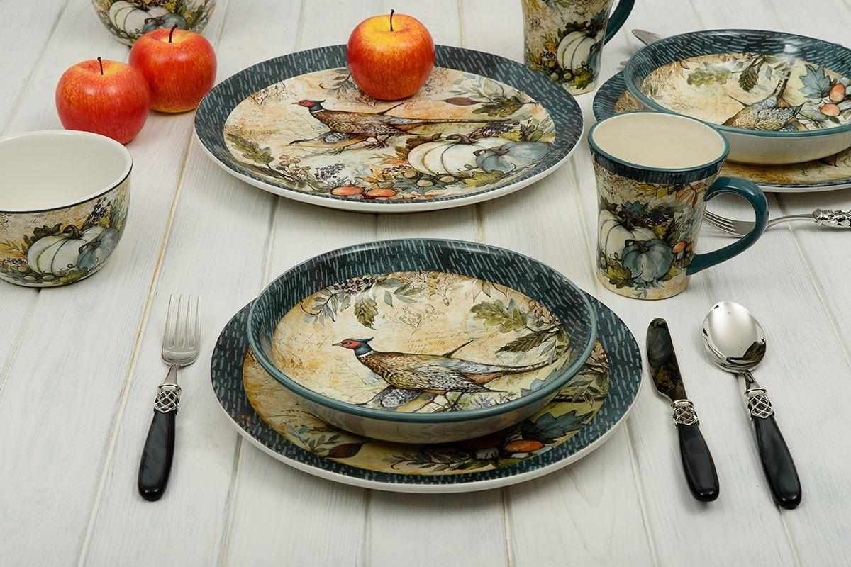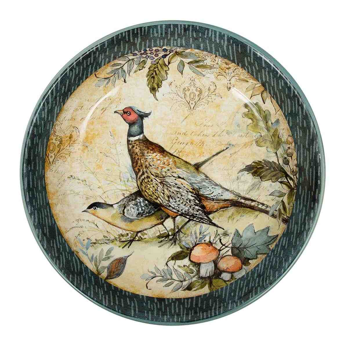 Безупречный дизайн в виде осенней лесной акварели специально для Certified International разработала популярная американская художница Сьюзан Уингет. Прогуливающаяся пара фазанов изображена так, словно вы наблюдаете за птицами из укрытия. Листья, грибы и прочие атрибуты осени написаны в тонах, схожих с пестрым птичьим оперением.