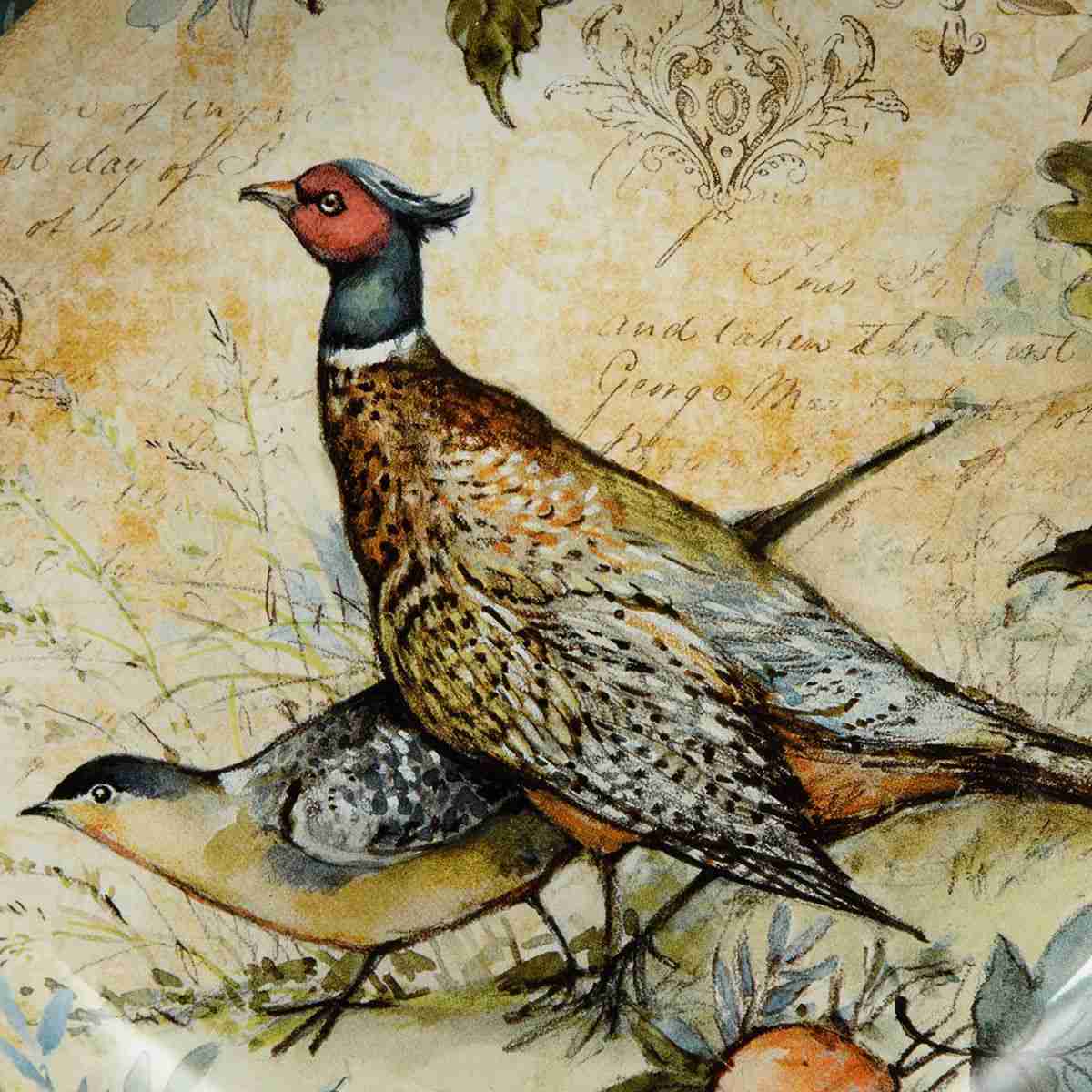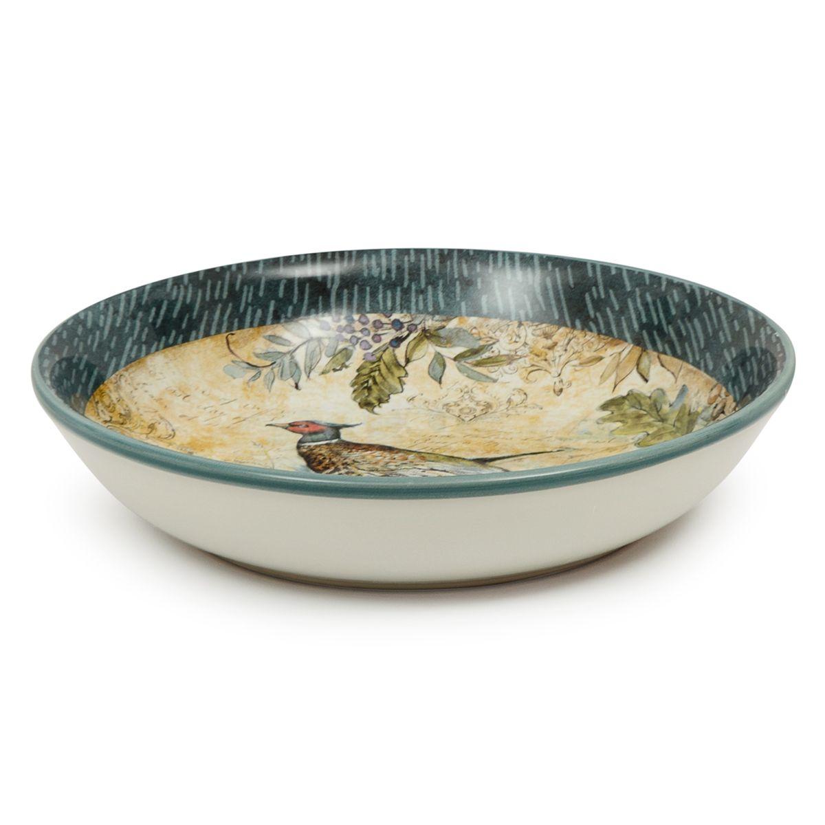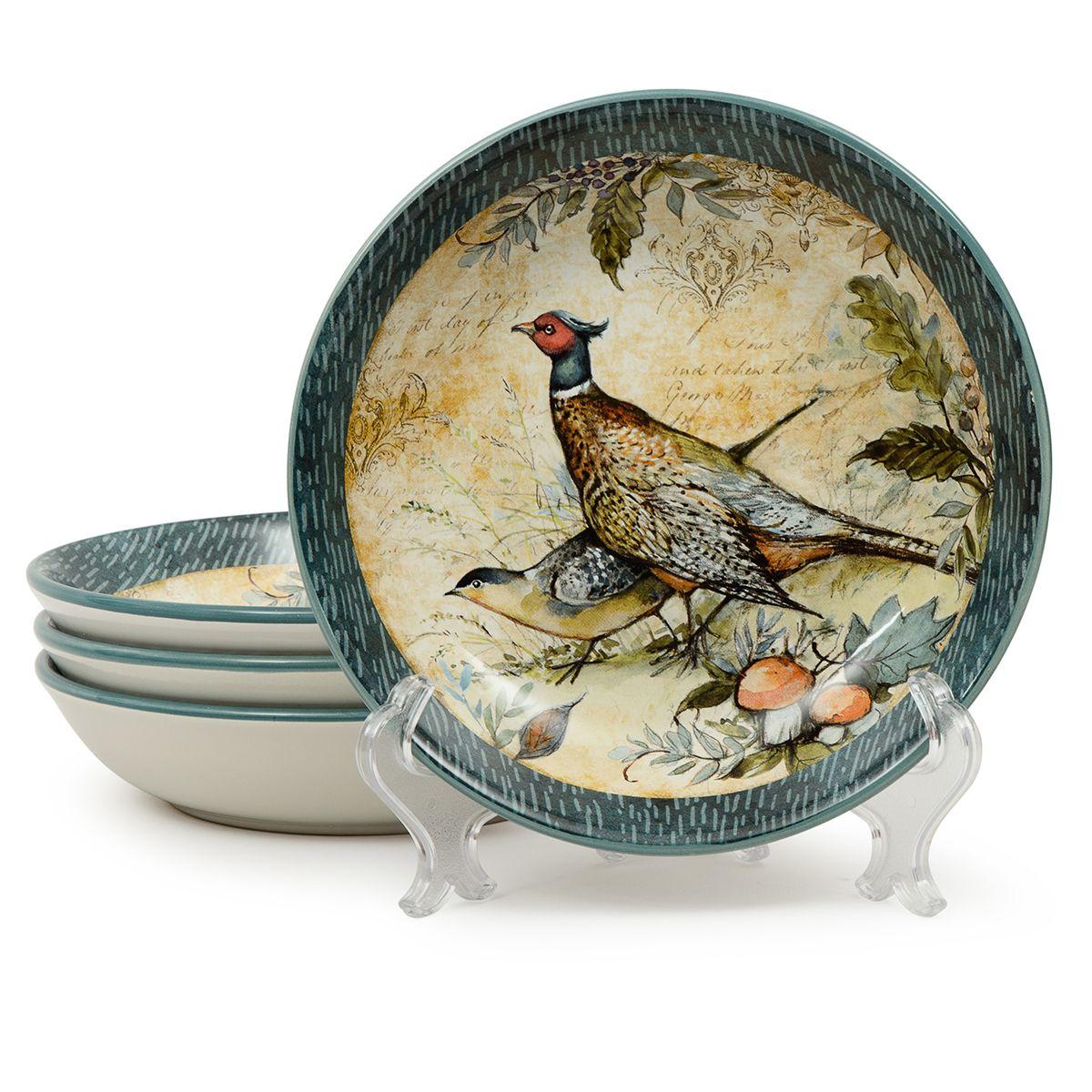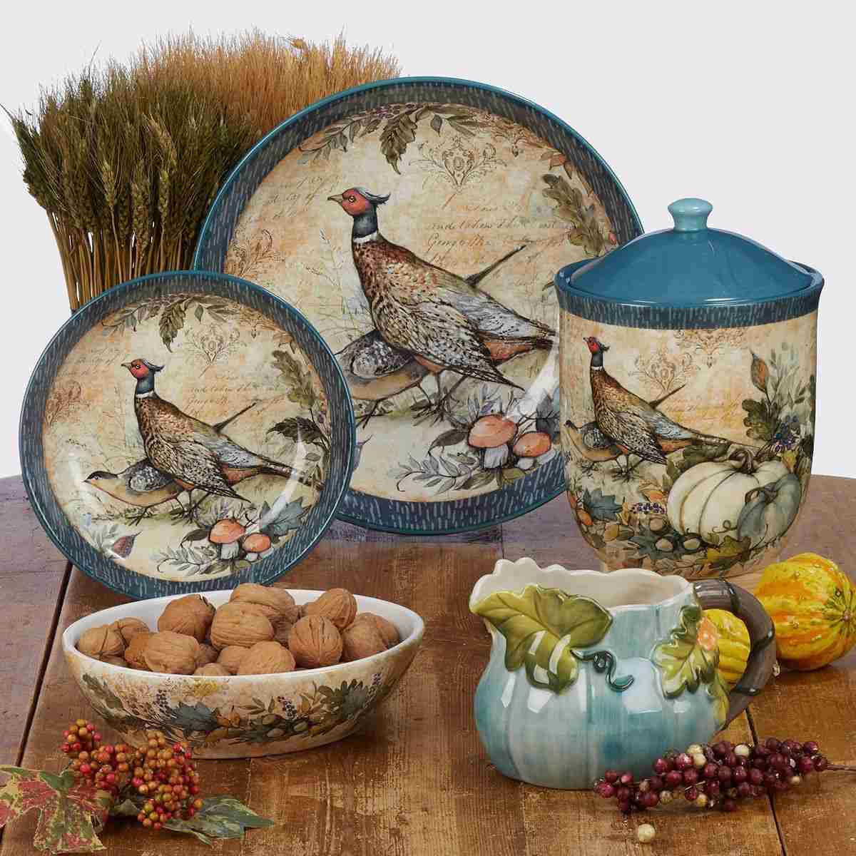 Безупречный дизайн в виде осенней лесной акварели специально для Certified International разработала популярная американская художница Сьюзан Уингет. Прогуливающаяся пара фазанов изображена так, словно вы наблюдаете за птицами из укрытия. Листья, грибы и прочие атрибуты осени написаны в тонах, схожих с пестрым птичьим оперением.